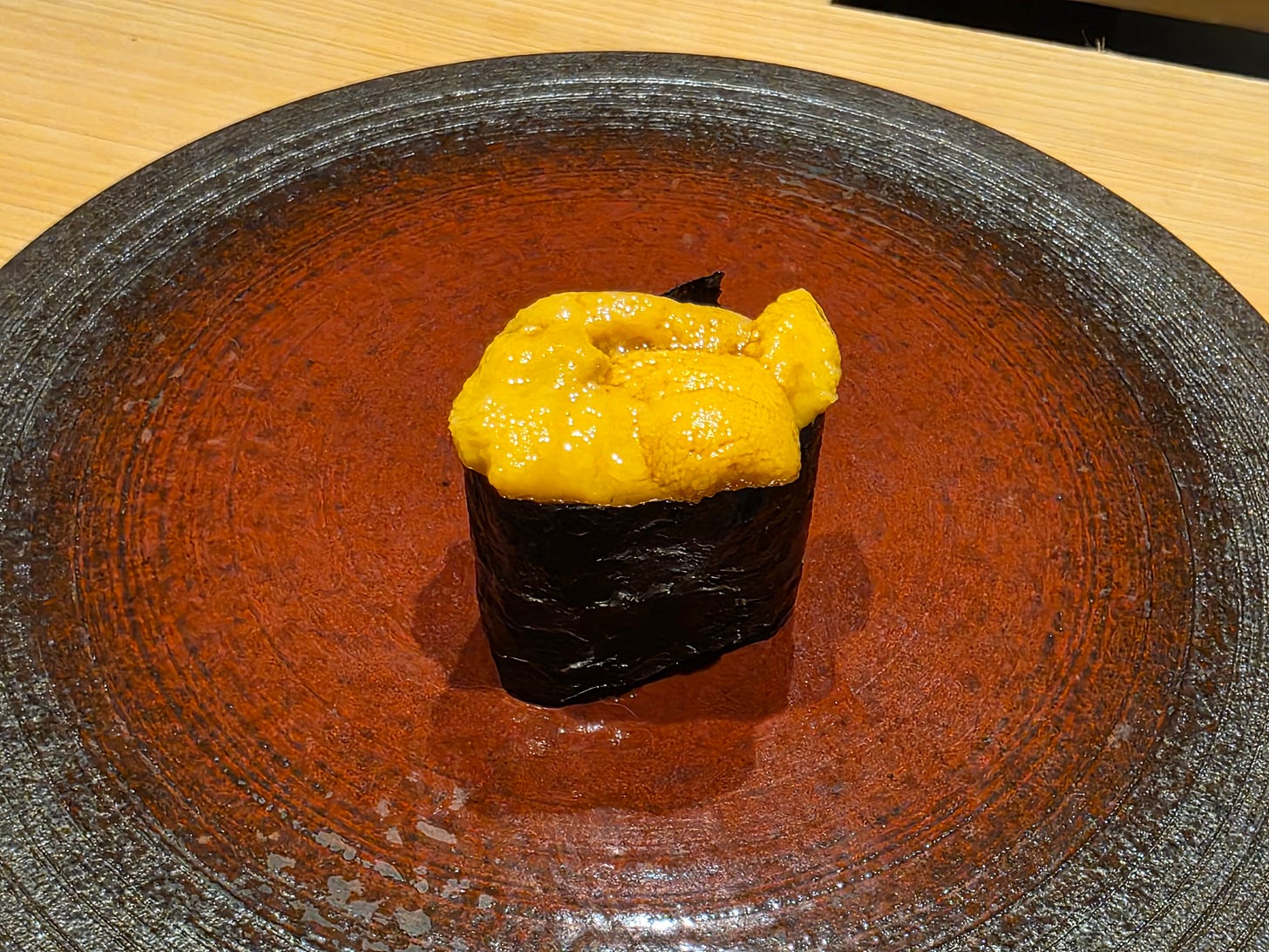 Another omakase classic, the uni roll, with two kinds of uni - both from the Yoichi area of Hokkaido. Rich, decadent with a sharp kick of wasabi at the end.