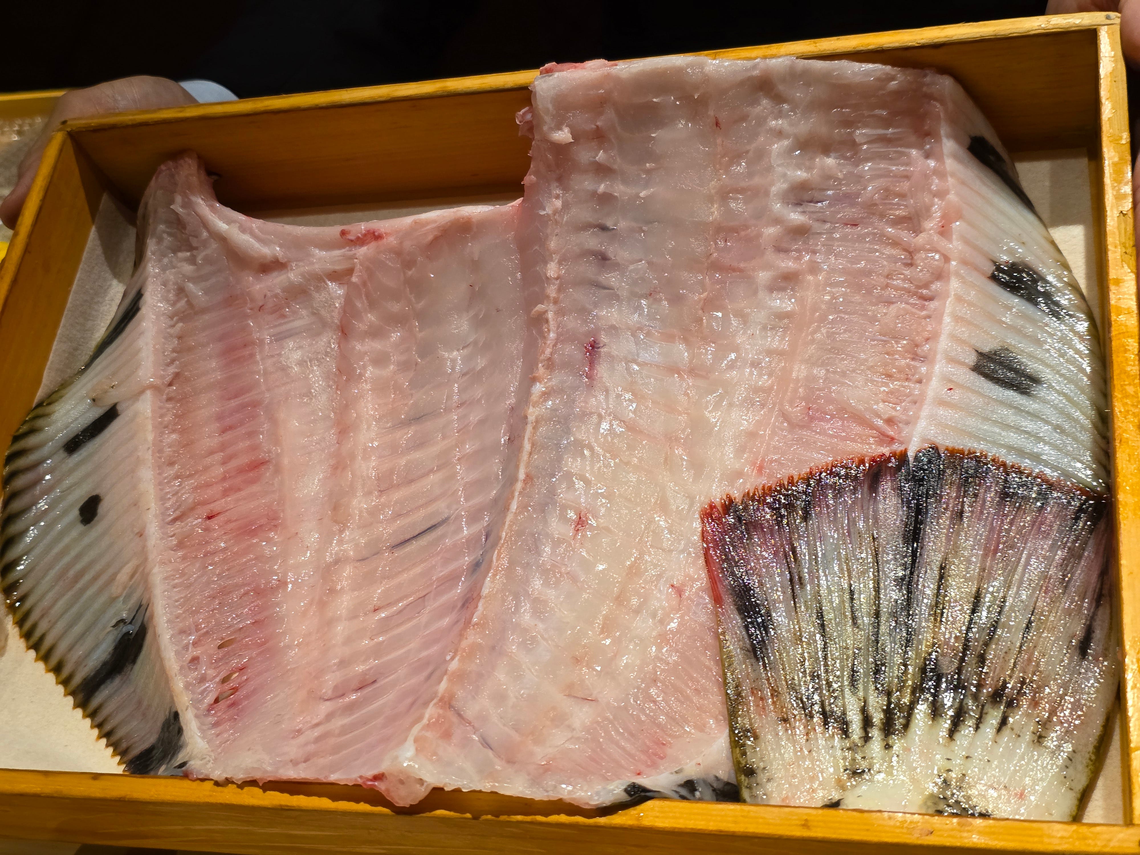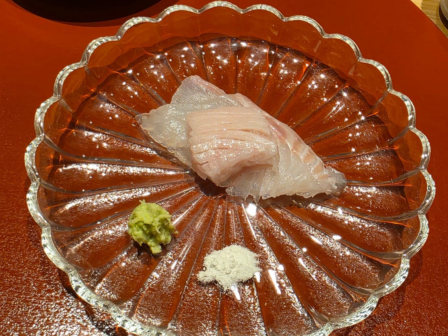 The dish was two cuts of sashimi from a Hokkaido flounder, a chewier, denser muscular cut and a more traditional piece. We were told to use wasabi and soy for the first cut, while trying wasabi and salt for the second. Really neat contrast of textures from the same fish.