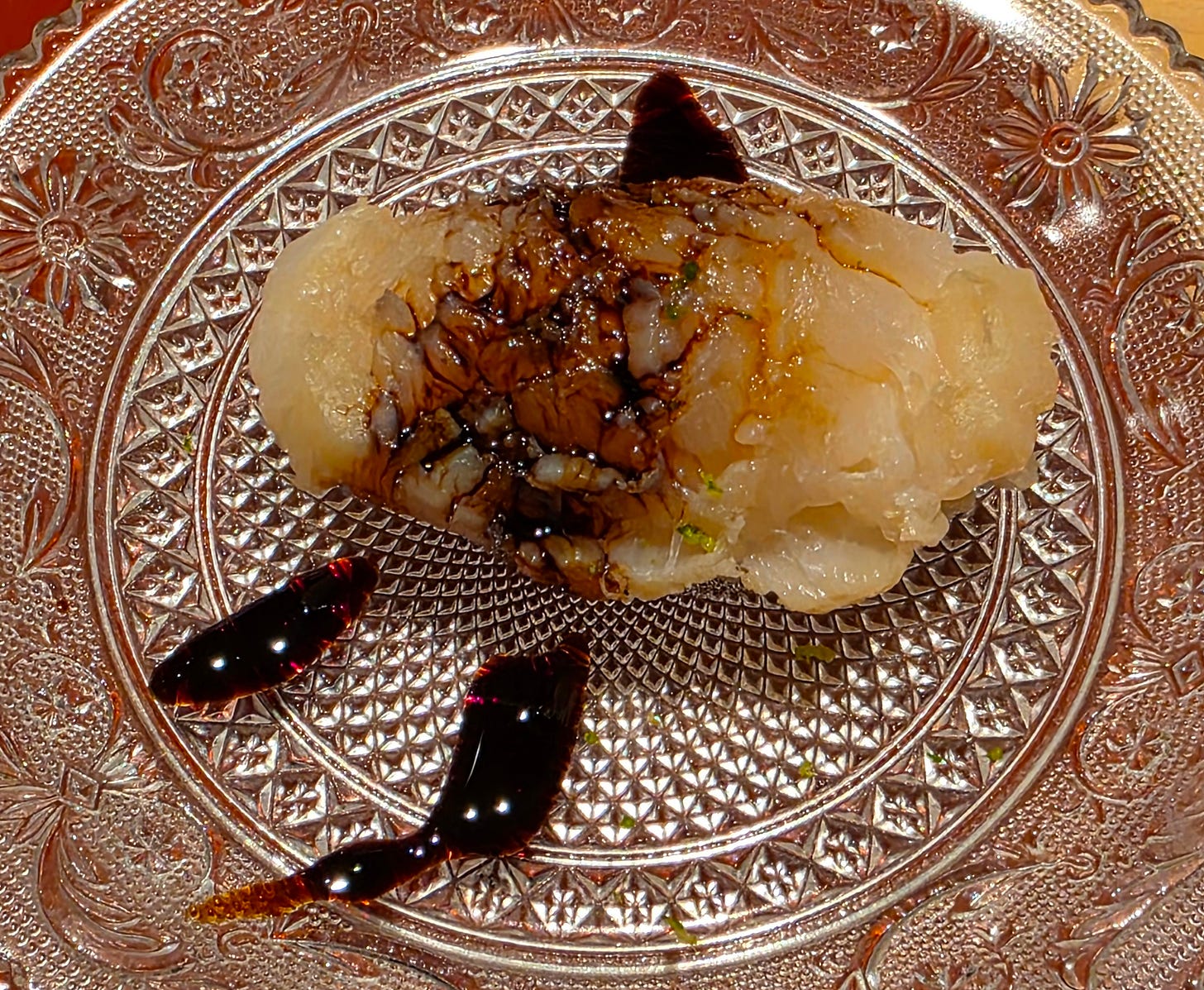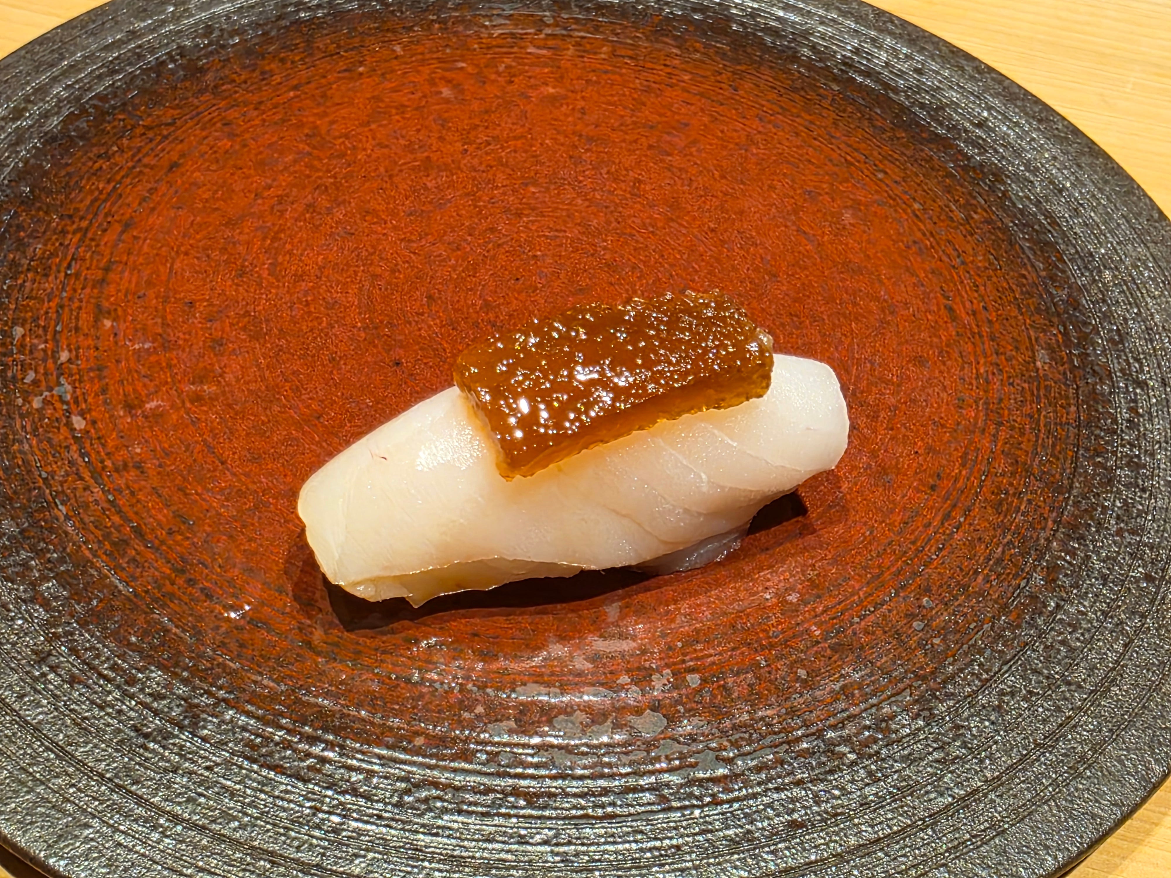 Next came a nigiri made from Pomfret butterfish with a sweet ponzu jelly on top - reminding me of a British quince paste. Personally, I’m not a huge fan of this fish - I tend to find it a bit dry and chalky, but it was very well executed.