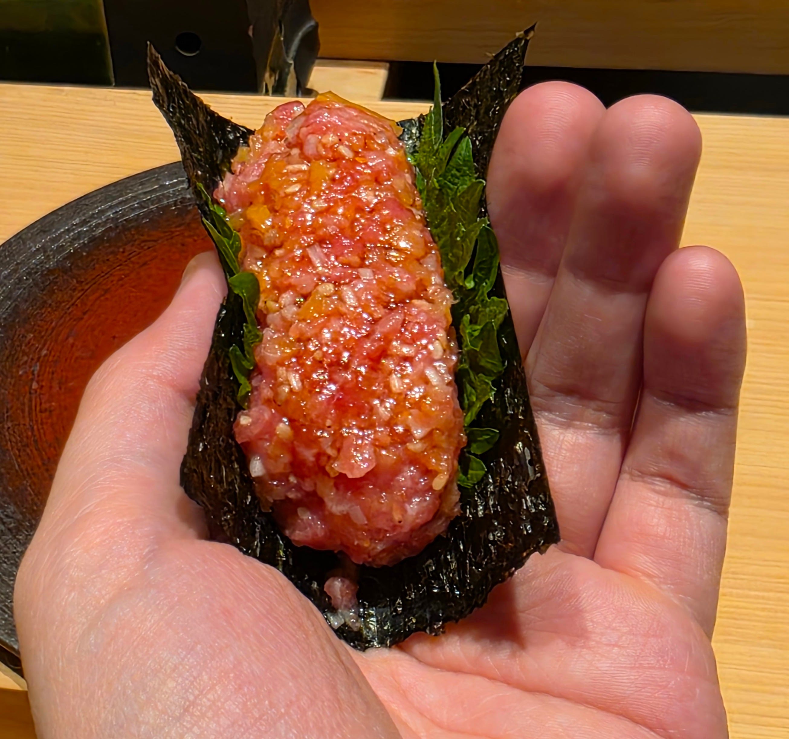 Another really unique take on the tuna mince roll. Usually, I’m not a fan, but the chef added pickled leeks and radish to add a bit of flavour and crunch. keeping the mince wrapped in a shizo leaf to prevent the seaweed from getting soggy. Another big hit!