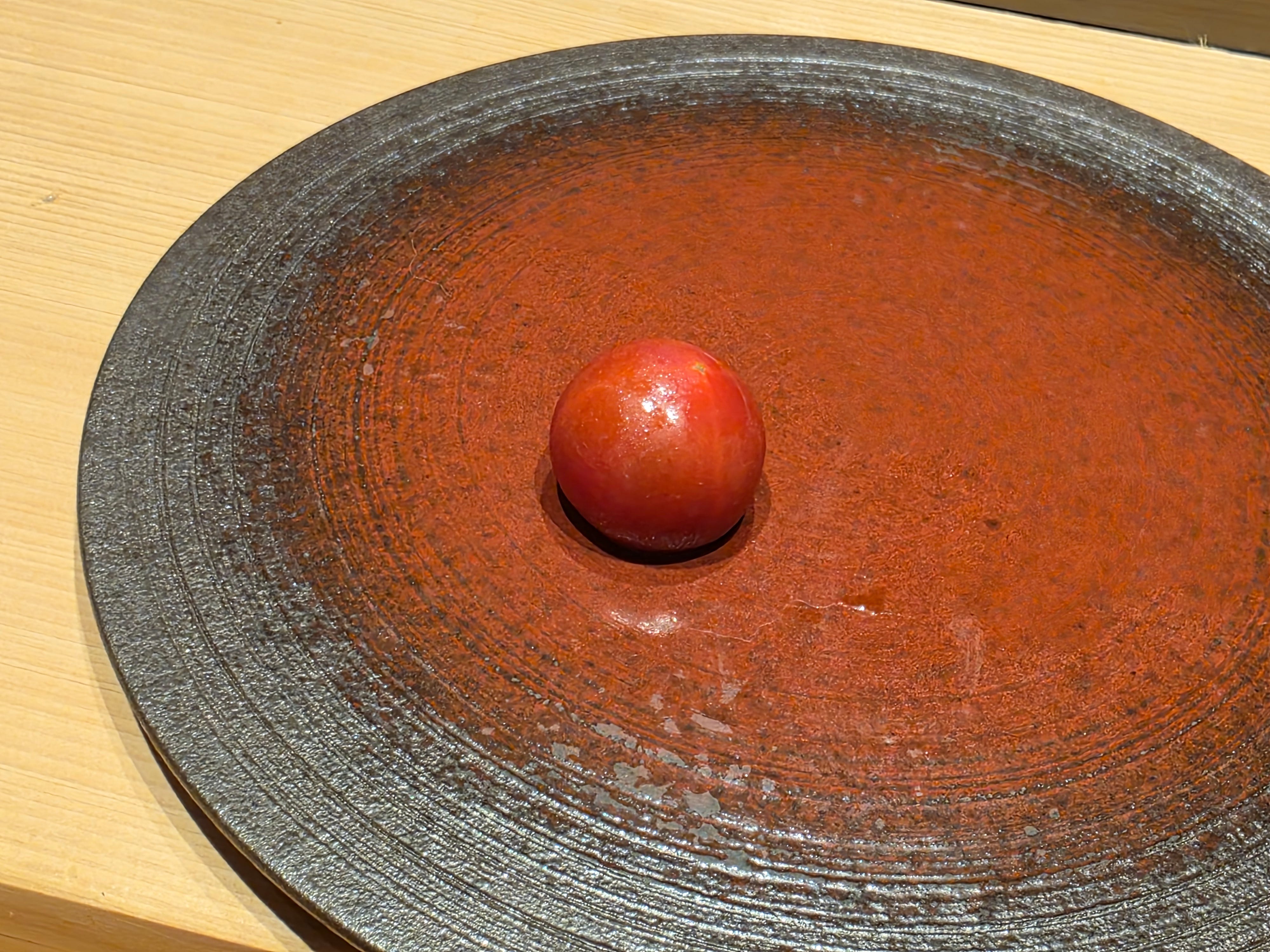 To finish off the meal, the traditional thimble of miso soup, and a single Japanese tomato. Apparently, it’s not a grape tomato, but a Japanese “fruit tomato” with double the sugar content of regular tomatoes, and approaching the levels of watermelons or strawberries.