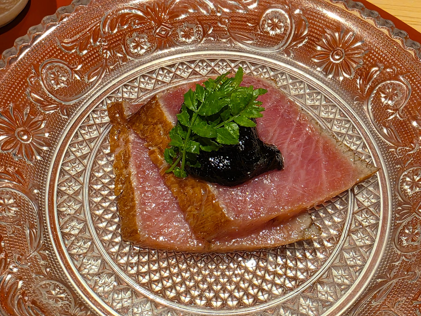 Next was a really neat dish - a smoked tuna loin seared with charcoal on all four edges, but otherwise left rare and topped with a dollop of seaweed soy paste. Almost bacon like, the charcoal searing left a bit of a bitter smokiness cutting through some of the fattiness of the tuna loin.