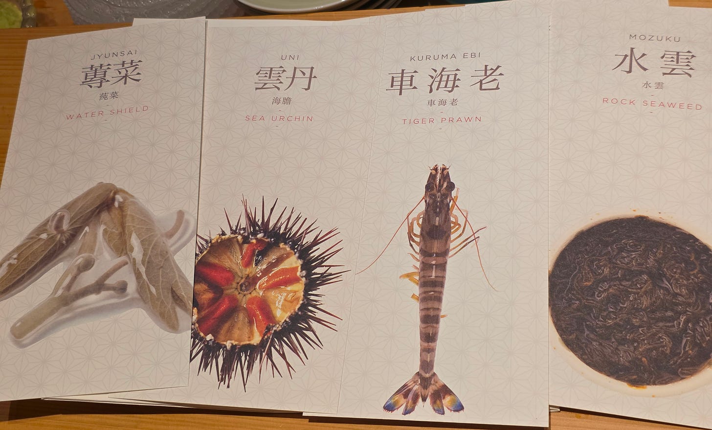 As the chef was preparing and skillfully presenting each dish, the restaurant manager explained the ingredients, sourcing, any interesting techniques or unique preparations used for the dish. He brought out cards explaining each ingredient and how they thought about combining them together.