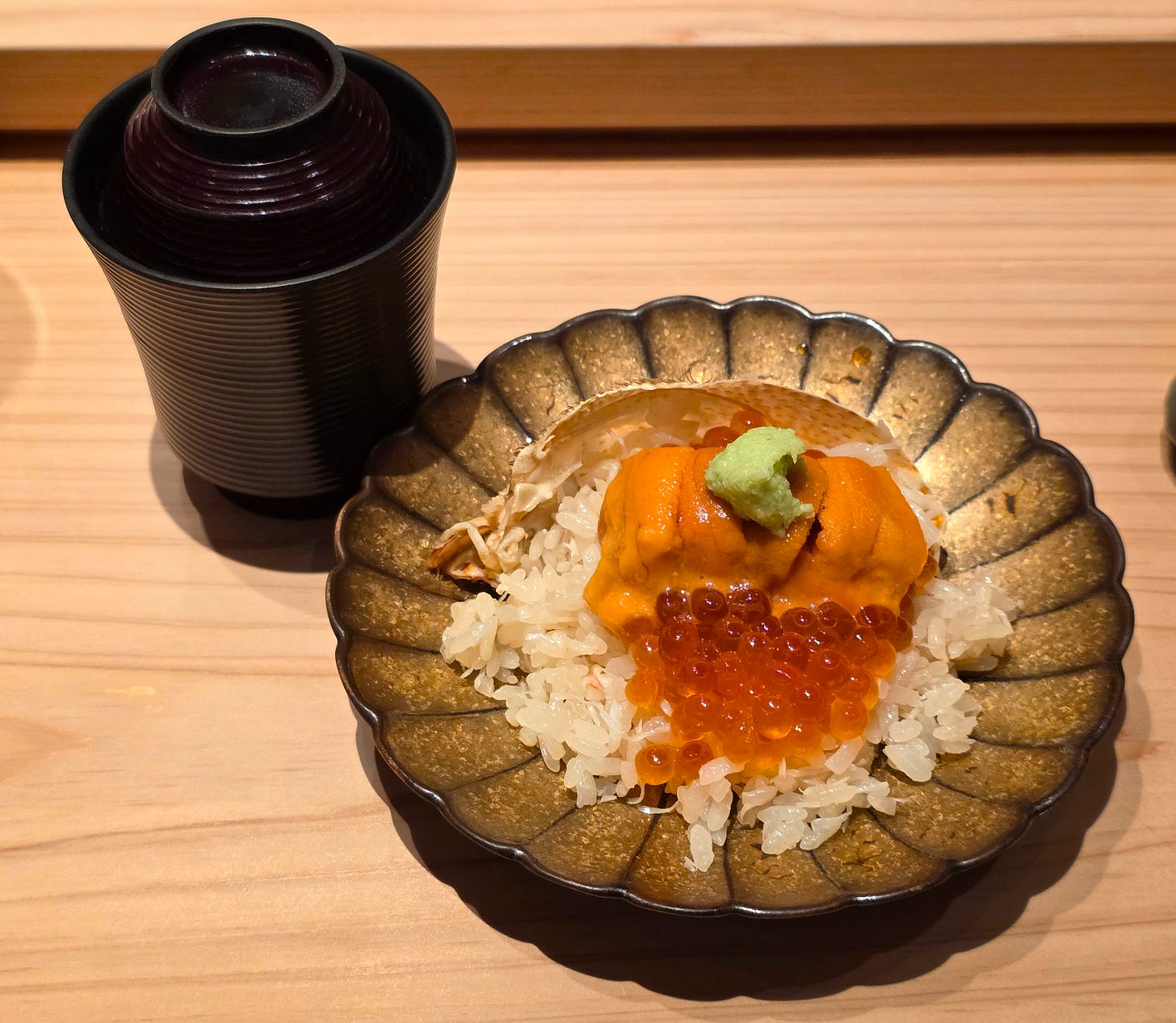 Crab rice, served in the shell and topped with uni and salmon roe, served alongside a thimble of miso soup, usually signifying the end of the savoury courses. If the meal ended here, I would’ve been perfectly satisfied.