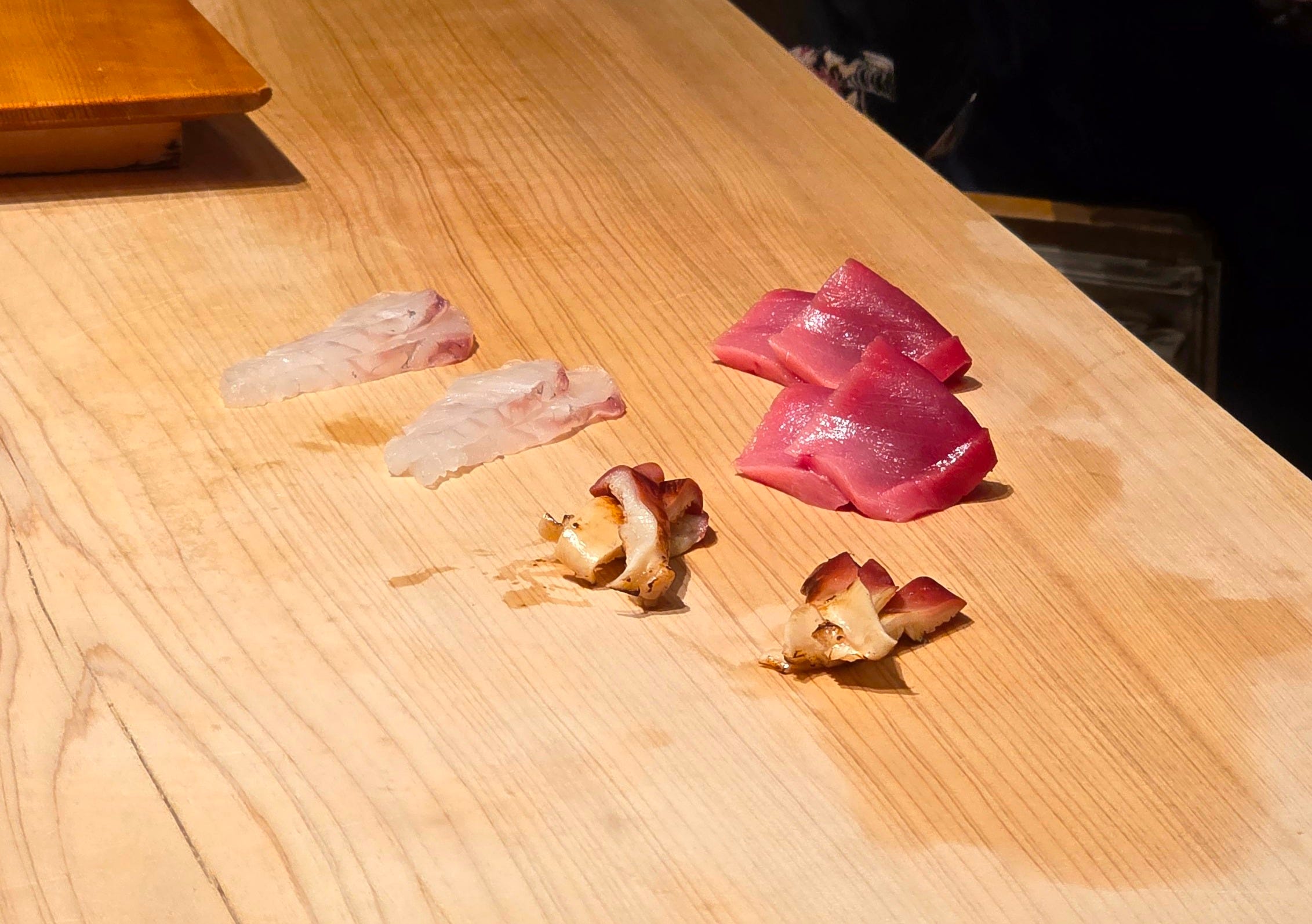 We arrived pretty late at night, and dinner service was already well underway. Two chefs working at the counter, each covering half the counter.
