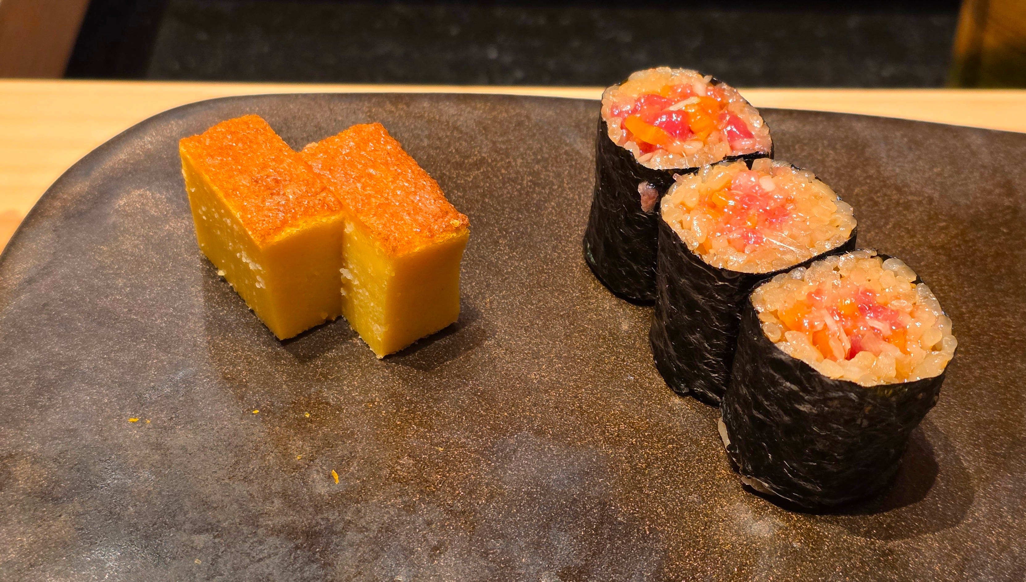 Finally, some minced tuna rolls, mixed in with some sweet Japanese pickles and leeks, as well as the classic egg castella. Now, signifying the end of the savoury courses!