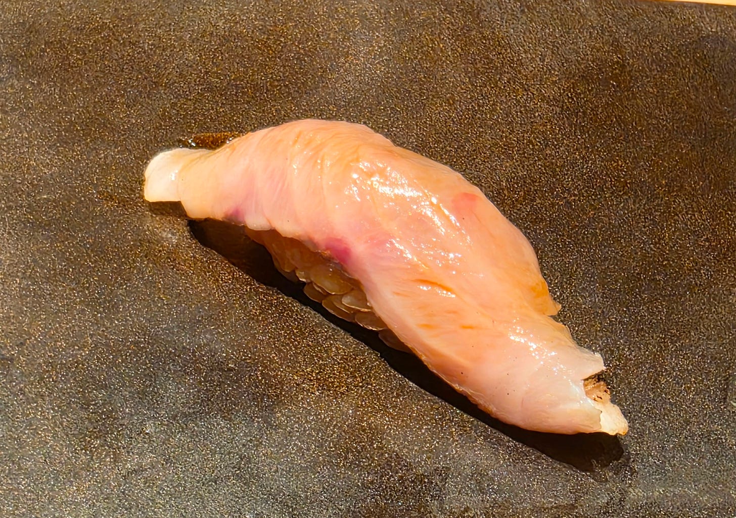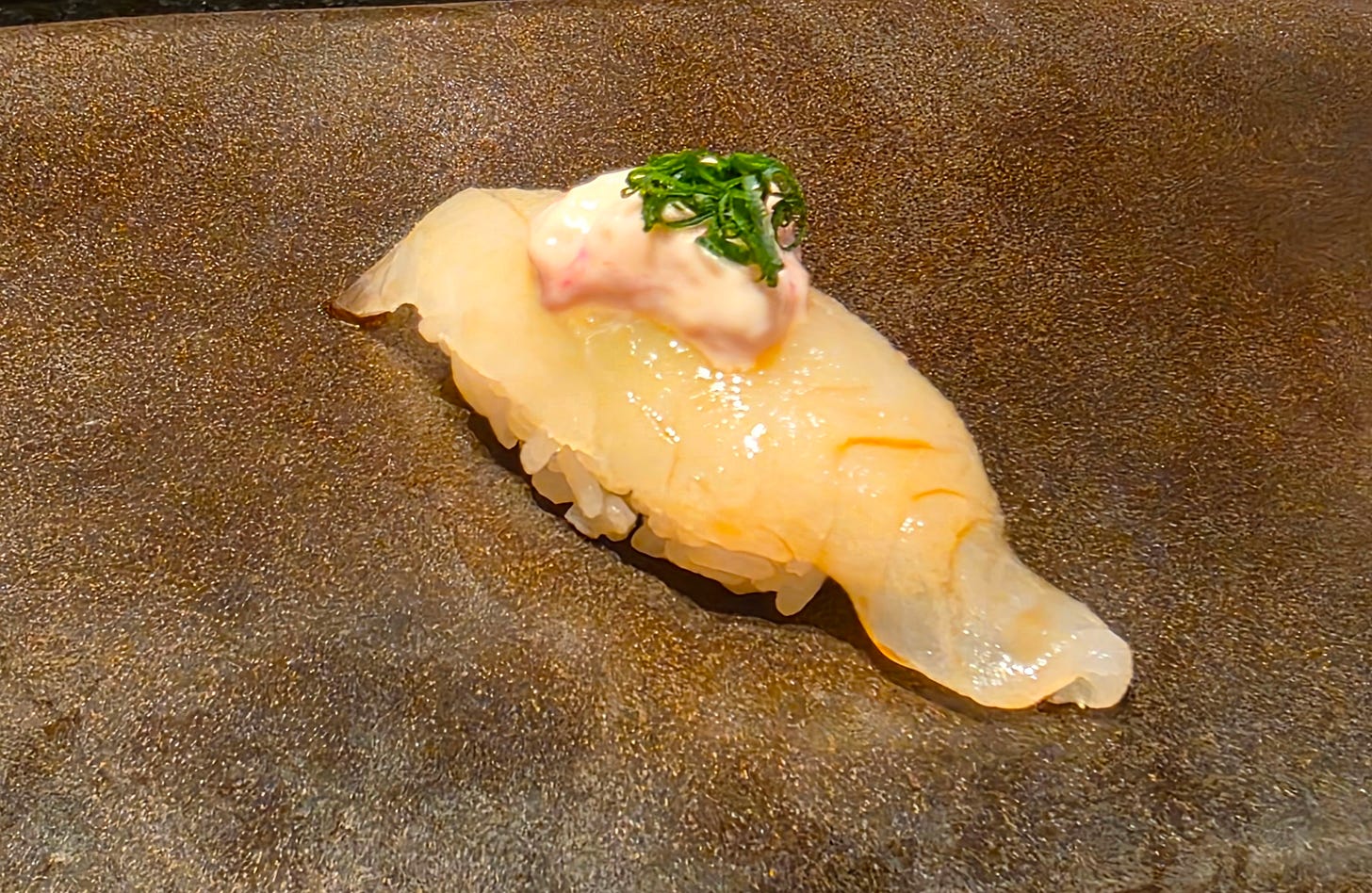 The first piece of nigiri was a leather jacket or kawahagi, known for its tough, leather-like skin. Firm, mildly sweet, and served with a piece of its creamy liver and shredded scallion on top.