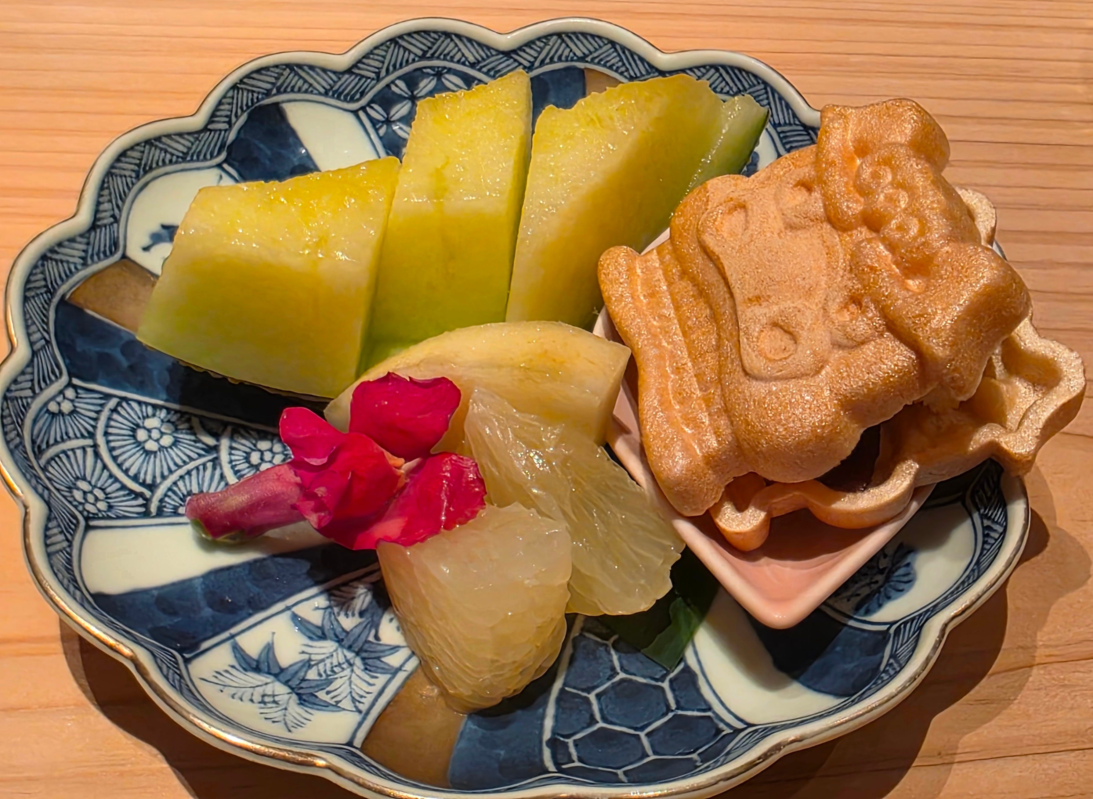 Finally, dessert, A variety of Japanese fruits - muskmelon, pomelo, Japanese snow pears, alongside a crisp rice cracker willed with red bean paste and vanilla ice cream.