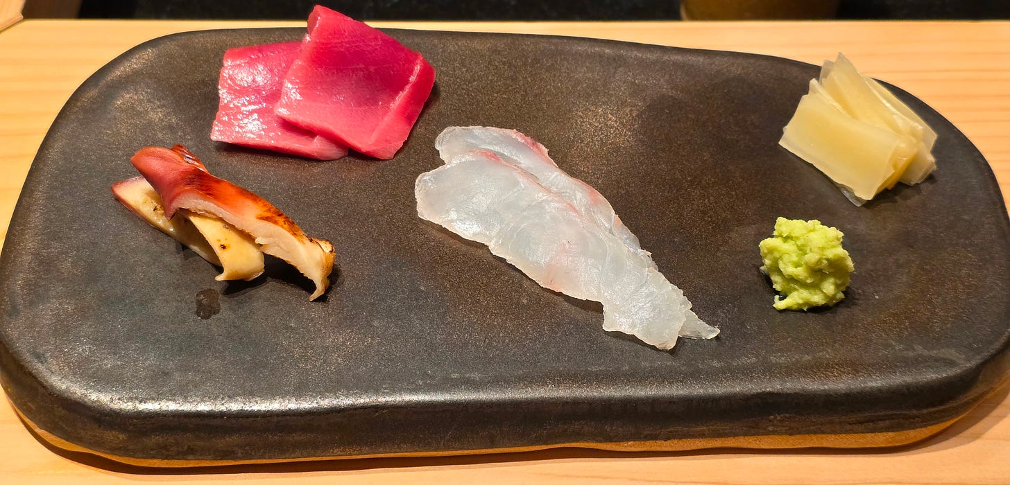 As we started aggressively attacking the bottle of sake, the chef prepared the sashimi course, slices of grilled arctic clam, chutoro, and flounder, served with freshly grated wasabi and a bit of pickled ginger.