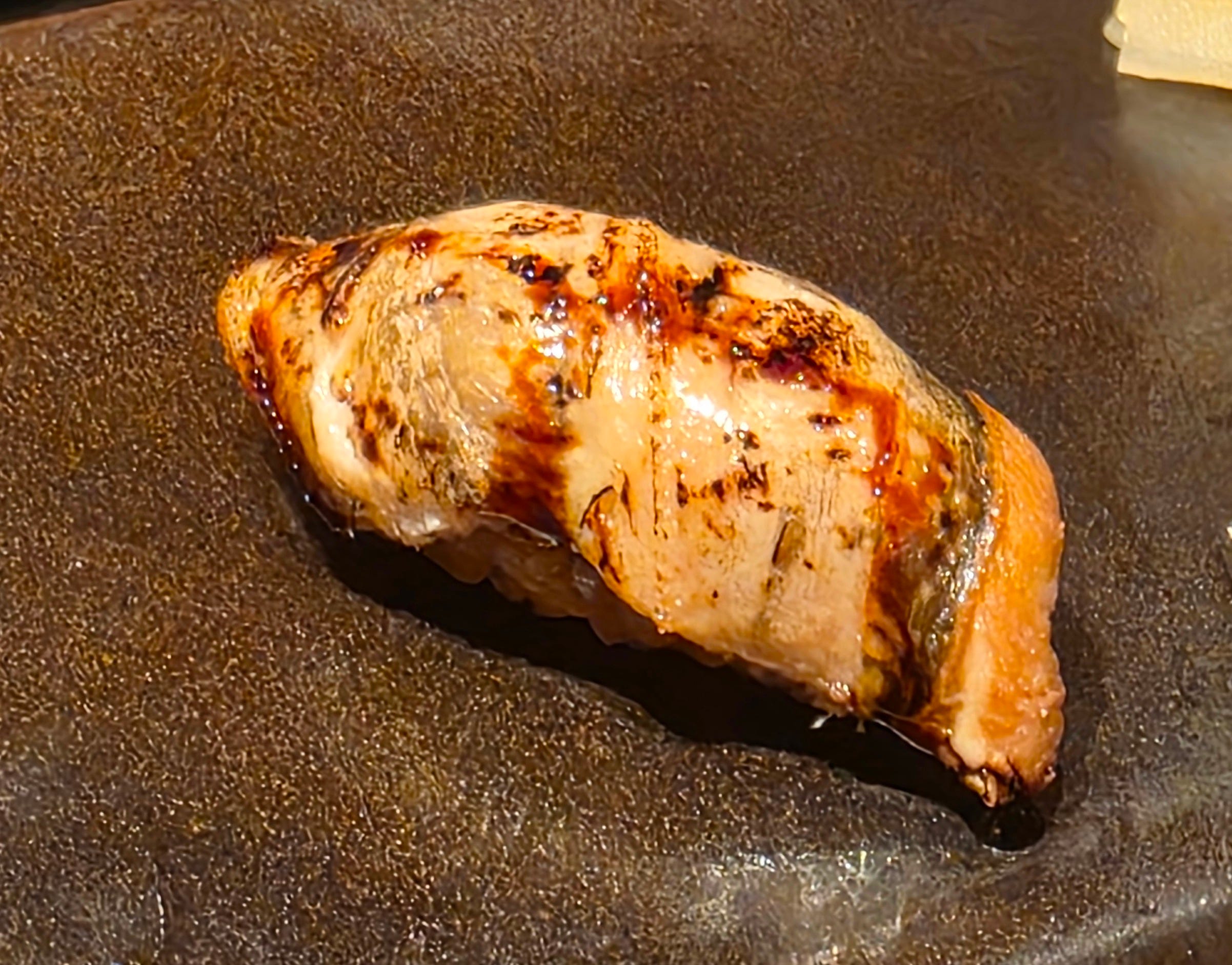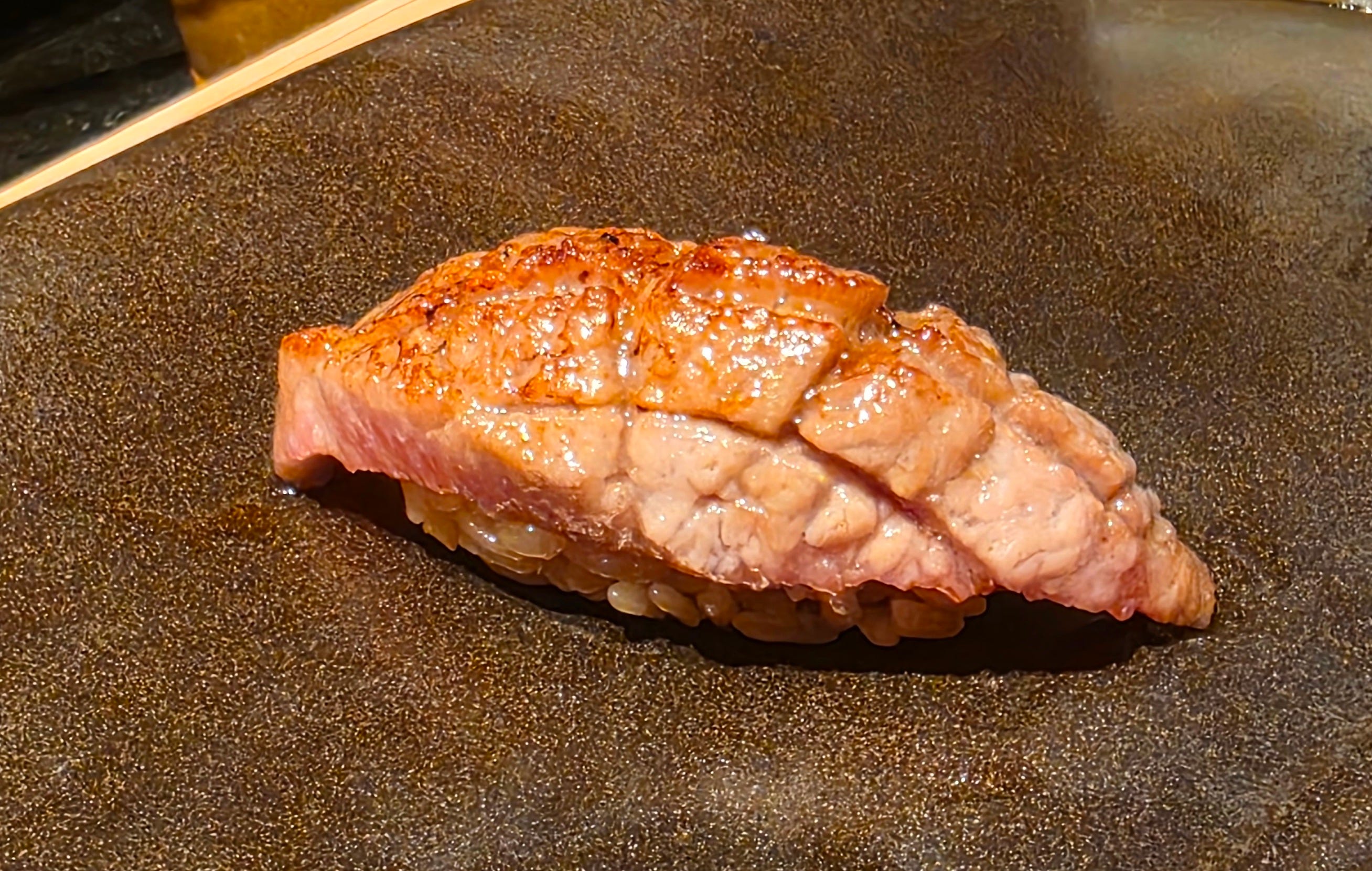 A piece of grilled eel nigiri, moving us toward the sweet end of the palate and toward dessert. I think this was the lighter and fluffier anago saltwater conger eel. Finished on the grill and served with a light coating of sticky sweet, kabayaki sauce, always a big hit.