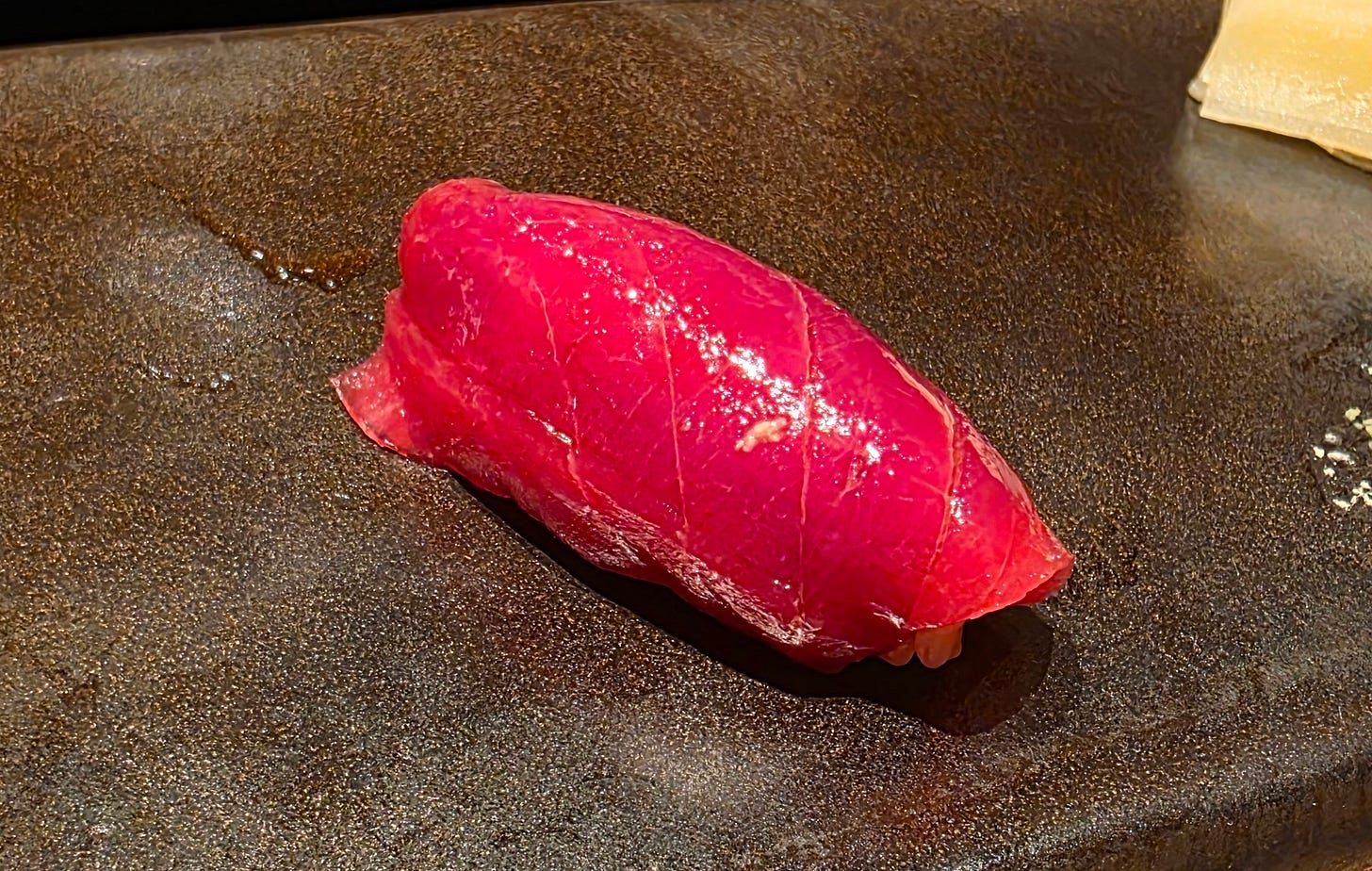The lean tuna or akami, glistening with a light coating of soy.