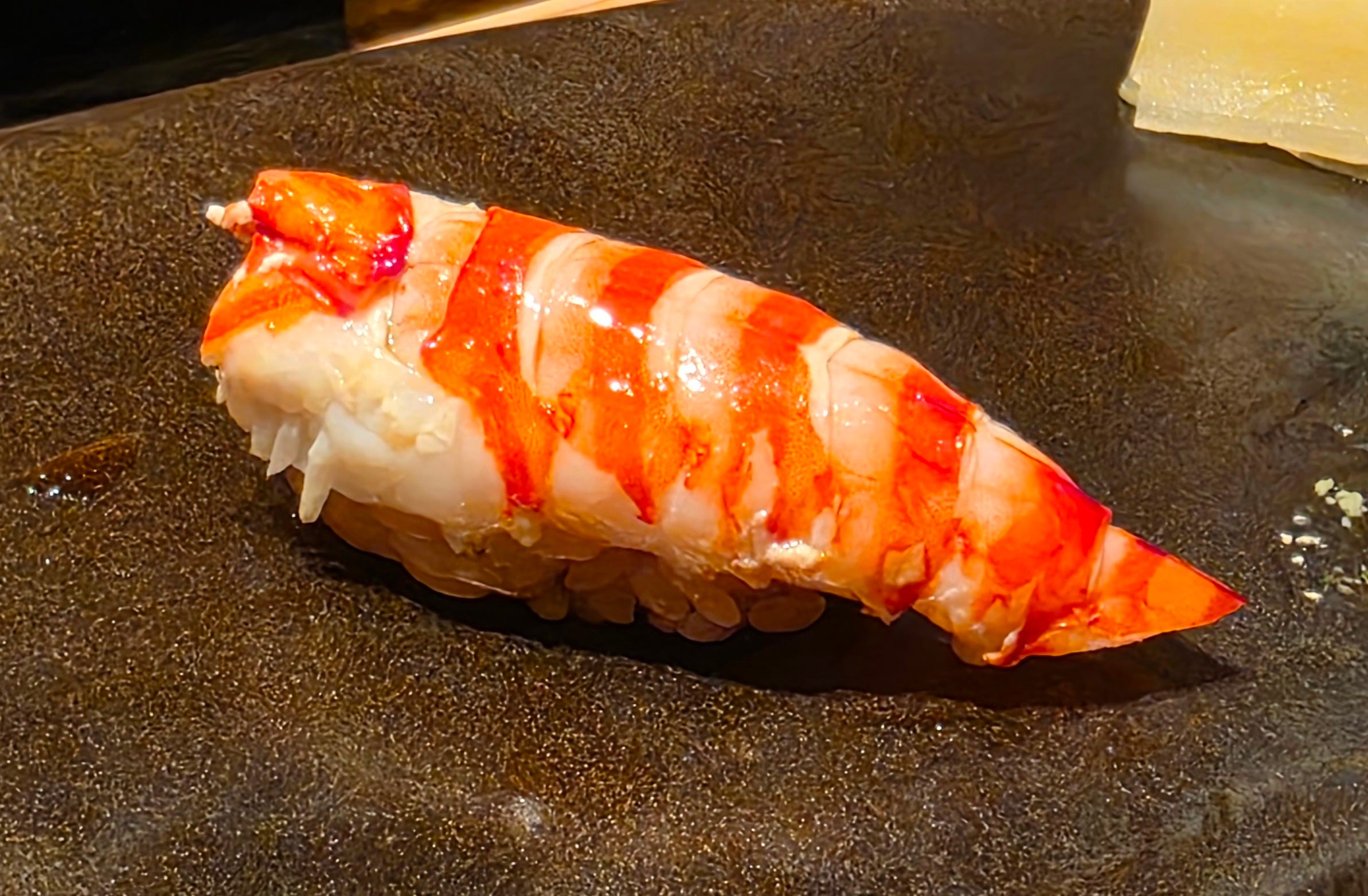The classic shrimp (ebi) nigiri, classically prepared. Not much to say about this one. Well executed, but otherwise, uneventful.