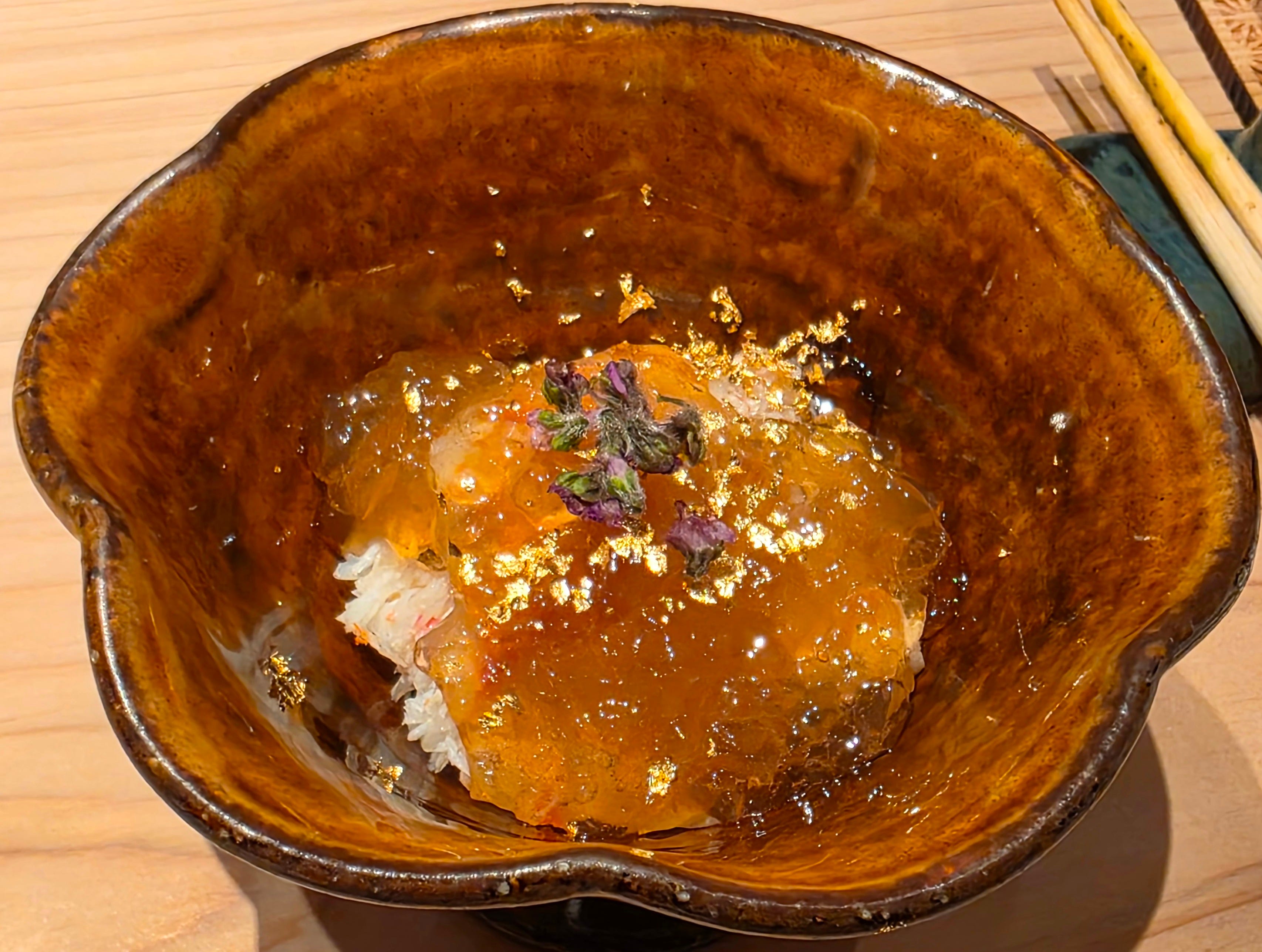 Picked crab leg meat, topped with a concentrated bonito broth jelly, topped with gold flake and perilla blossoms.