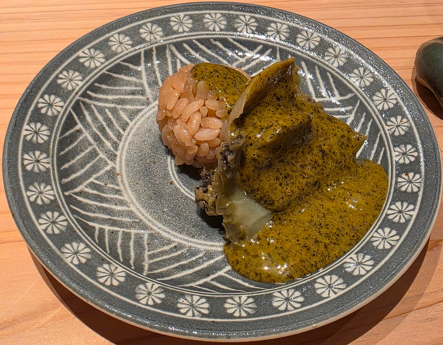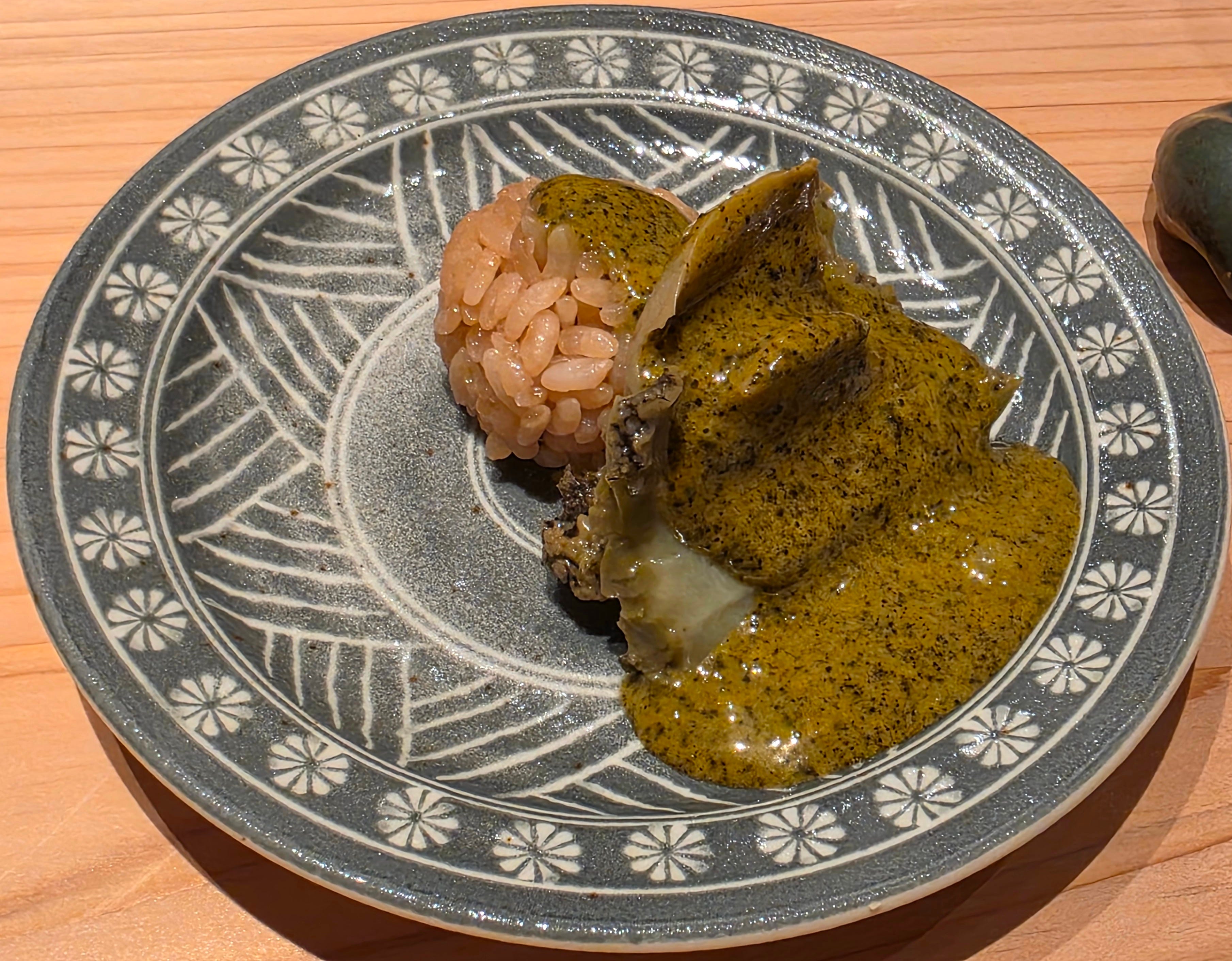 Another classic omakase dish, an extremely tender abalone, served with a rich, complex abalone liver sauce, with a small ball of rice to mop up the rest of the sauce. Always a hit, and absolutely amazing!