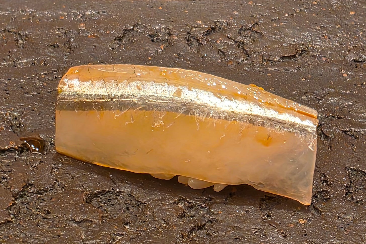 Following up with a golden eye snapper, sliced to highlight it’s vibrant red skin and slightly pink flesh. Rich buttery flavour, a slightly oily.