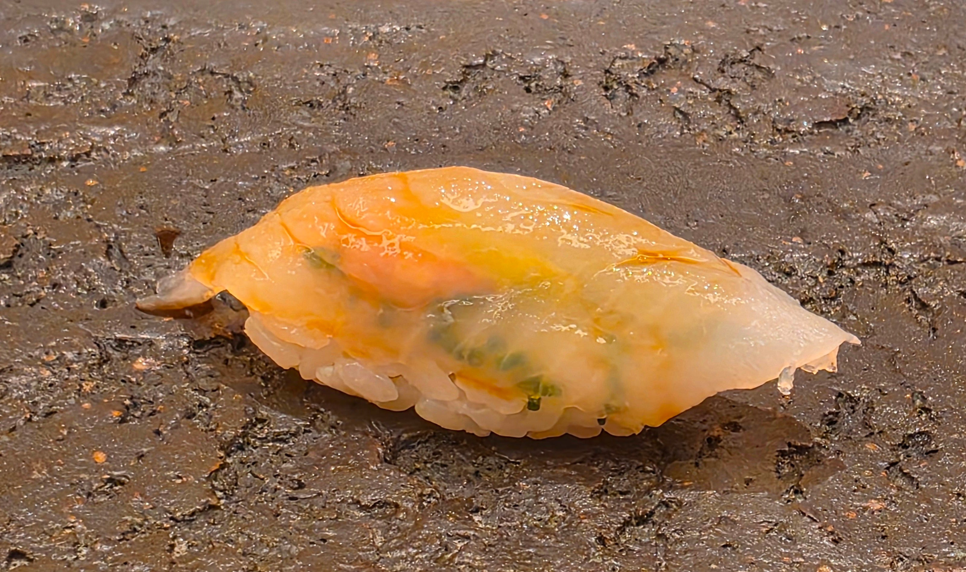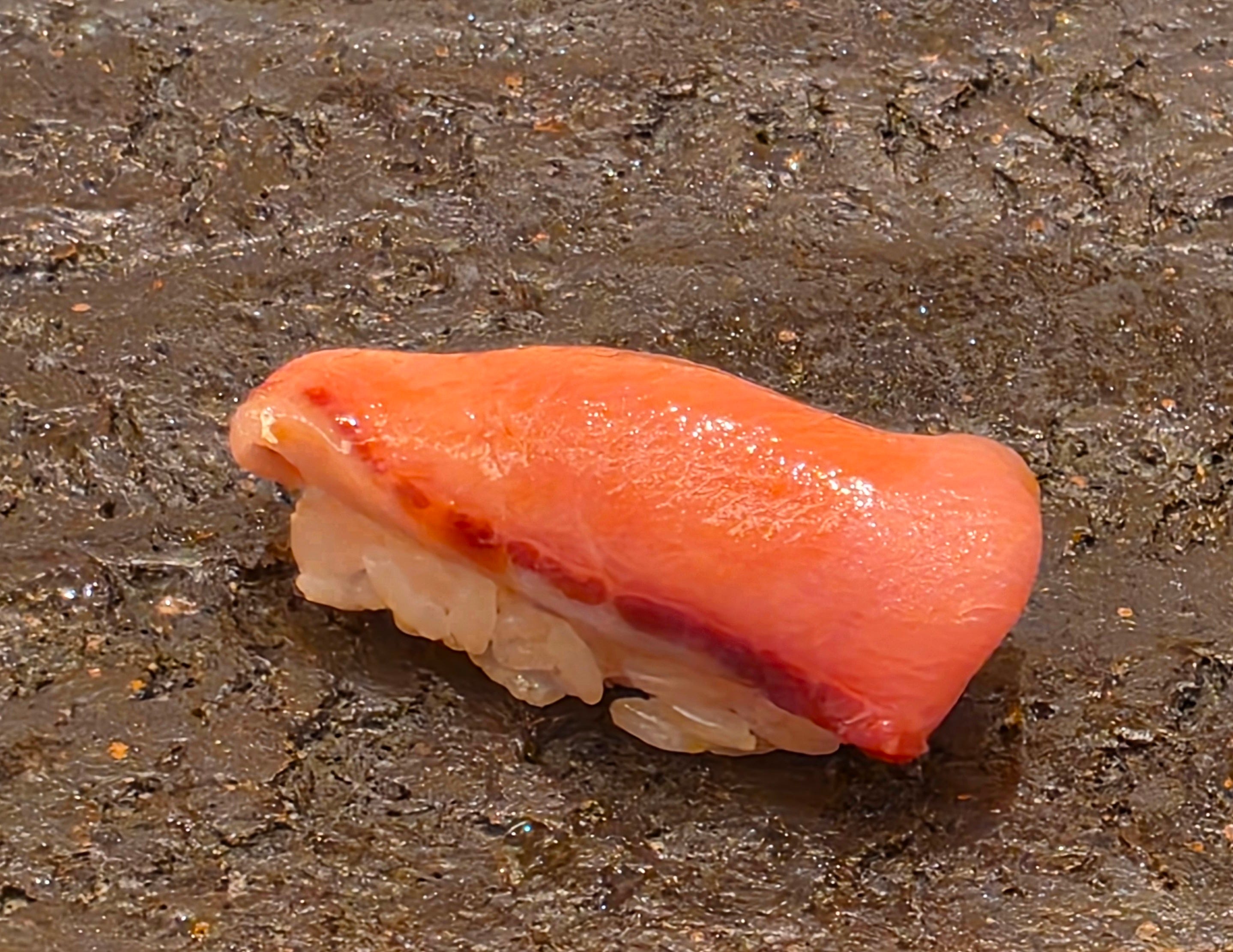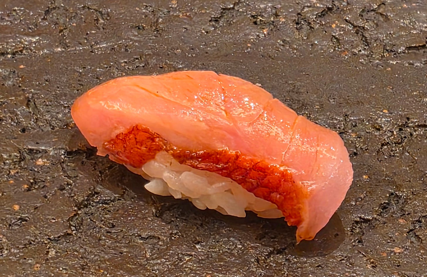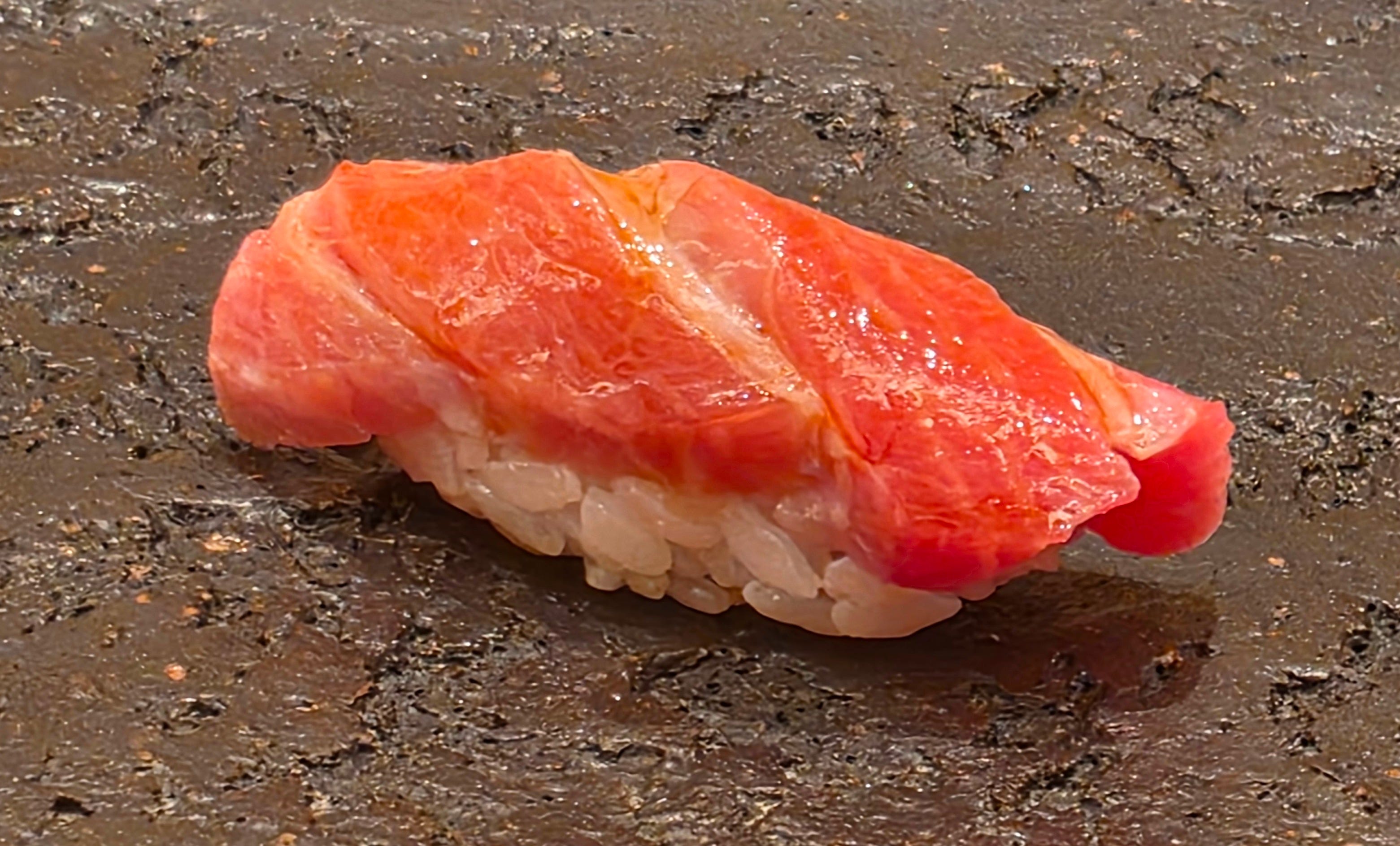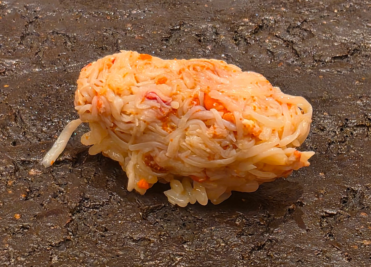 While not the most visually appealing, the biggest hit of the night, a generous handful of female snow crab, pressed into a sushi. First time I’ve seen it done in the nigiri-style instead of a handroll. Sweet, crabby, and absolutely delicious.