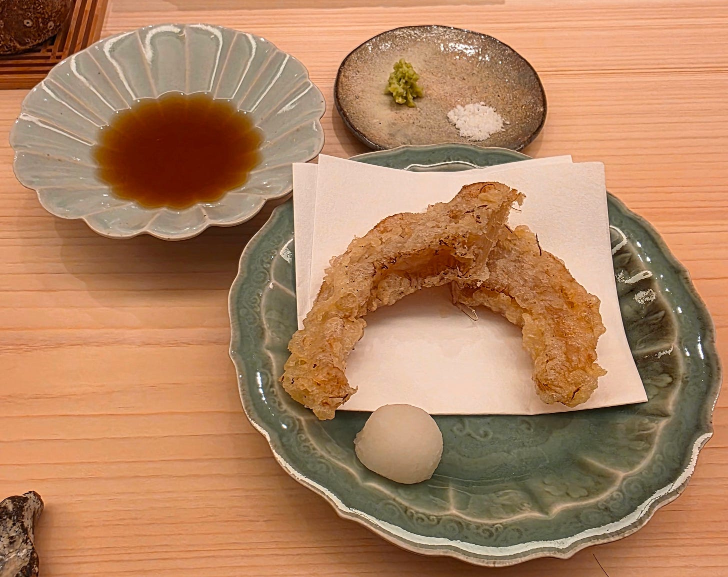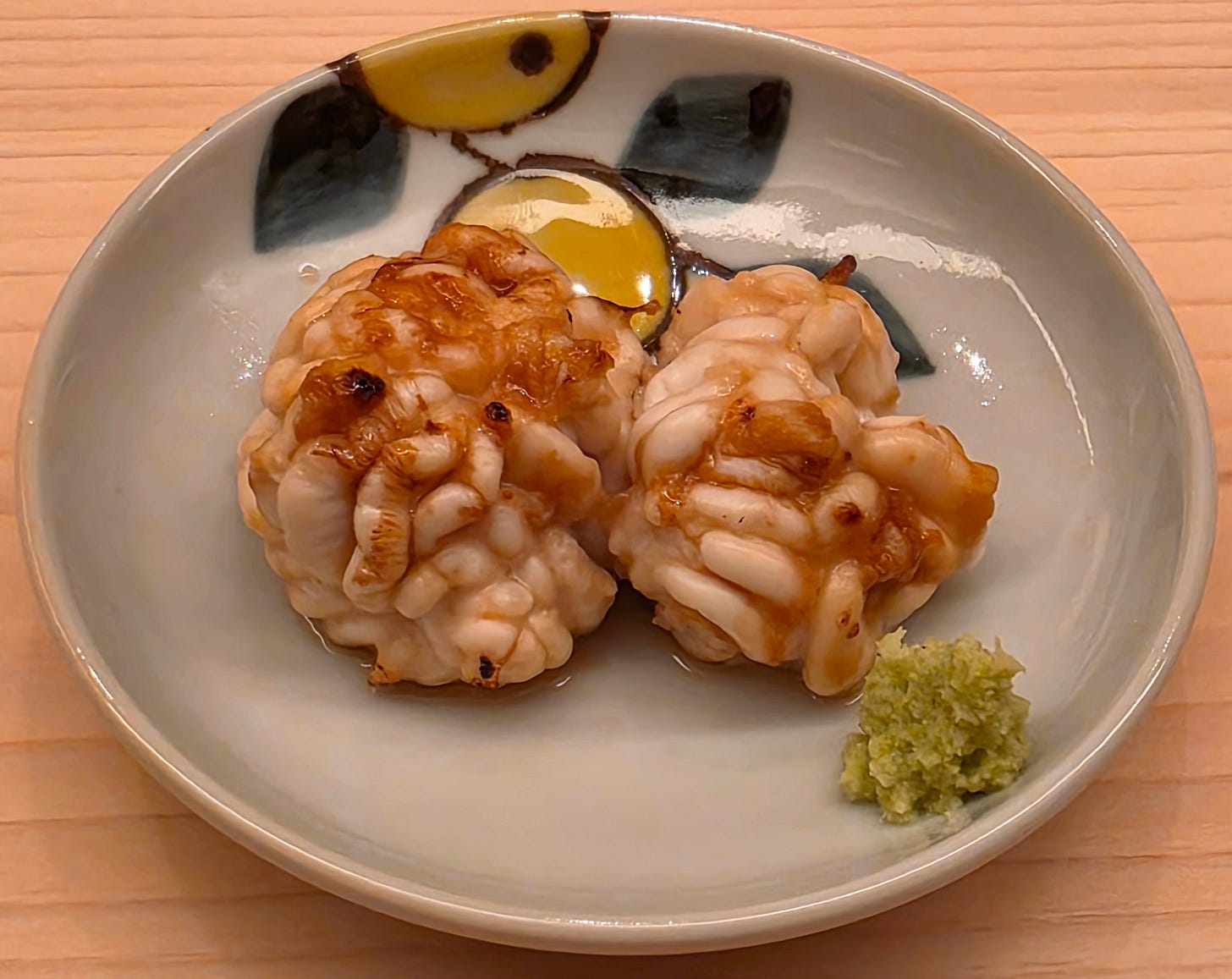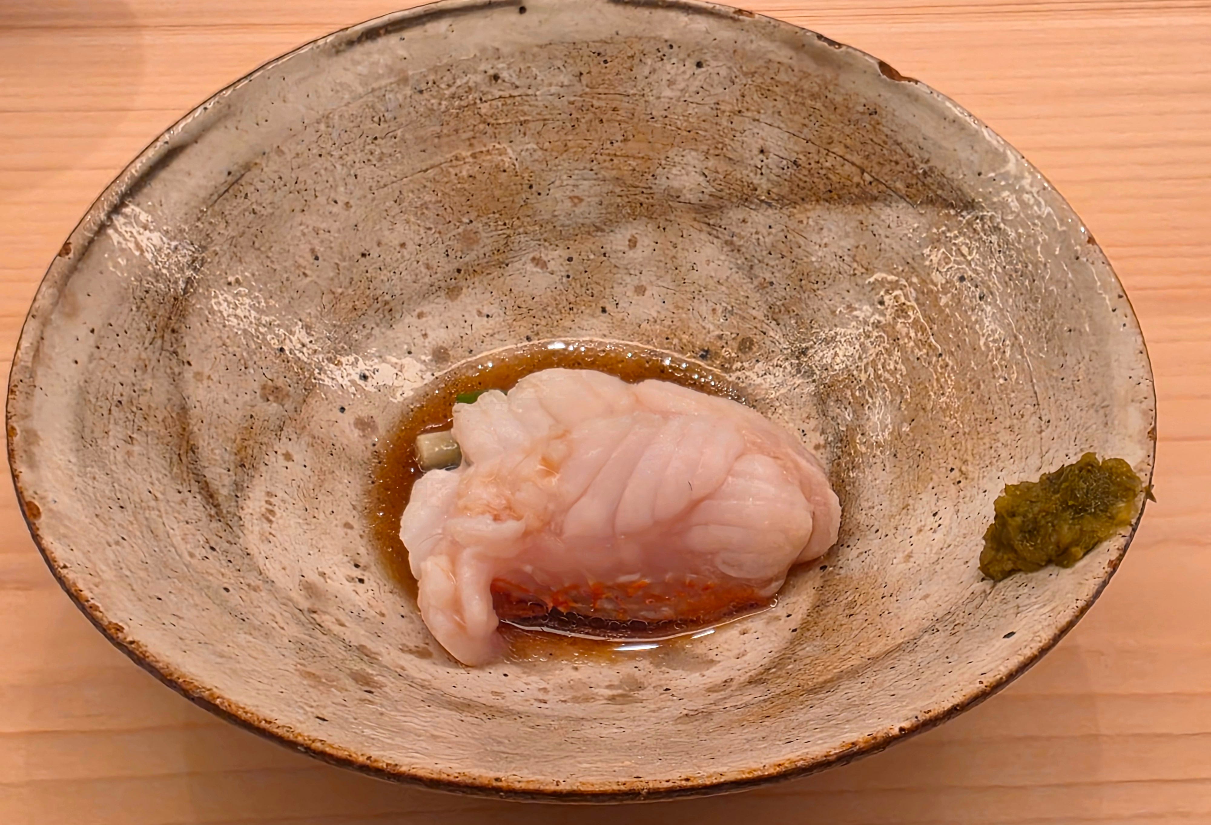Next a large serving of Shirako, or fish sperm sac, with a soy glaze and more fresh wasabi. Not the biggest fan of Shirako, but rich, creamy and not particularly unpleasant.