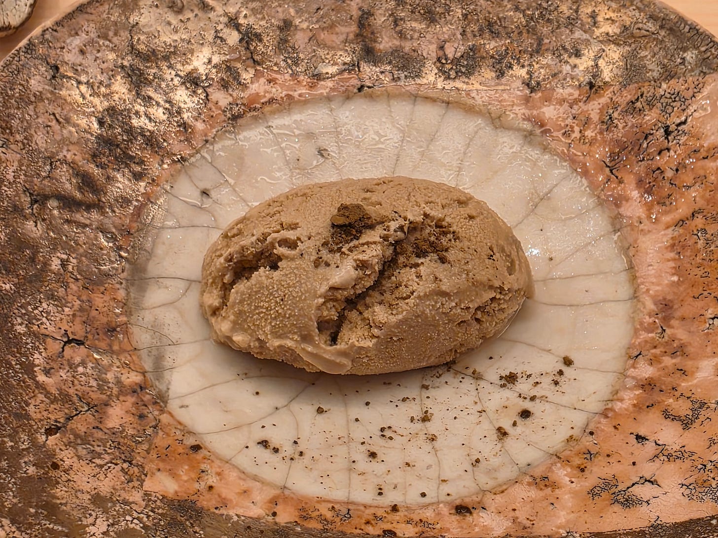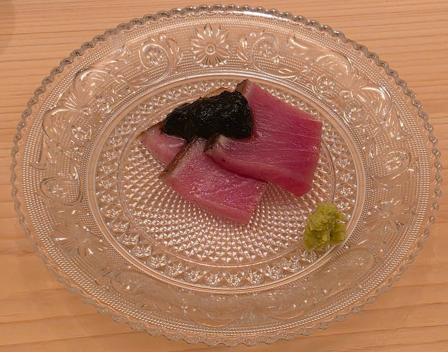 The first appetizer was young tuna, kissed with hot charcoal to produce a smoky, crispy skin, and a black, inky seaweed soy paste and a touch of freshly ground wasabi.