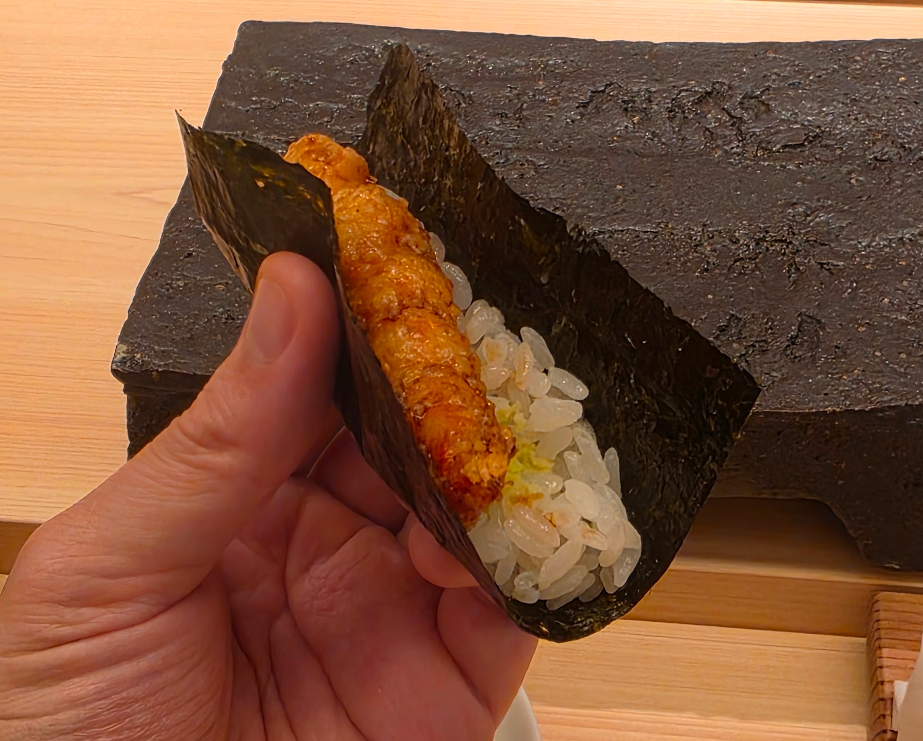 Finally, to finish off the main event, a handroll with a tempura prawn with a layer of uni.