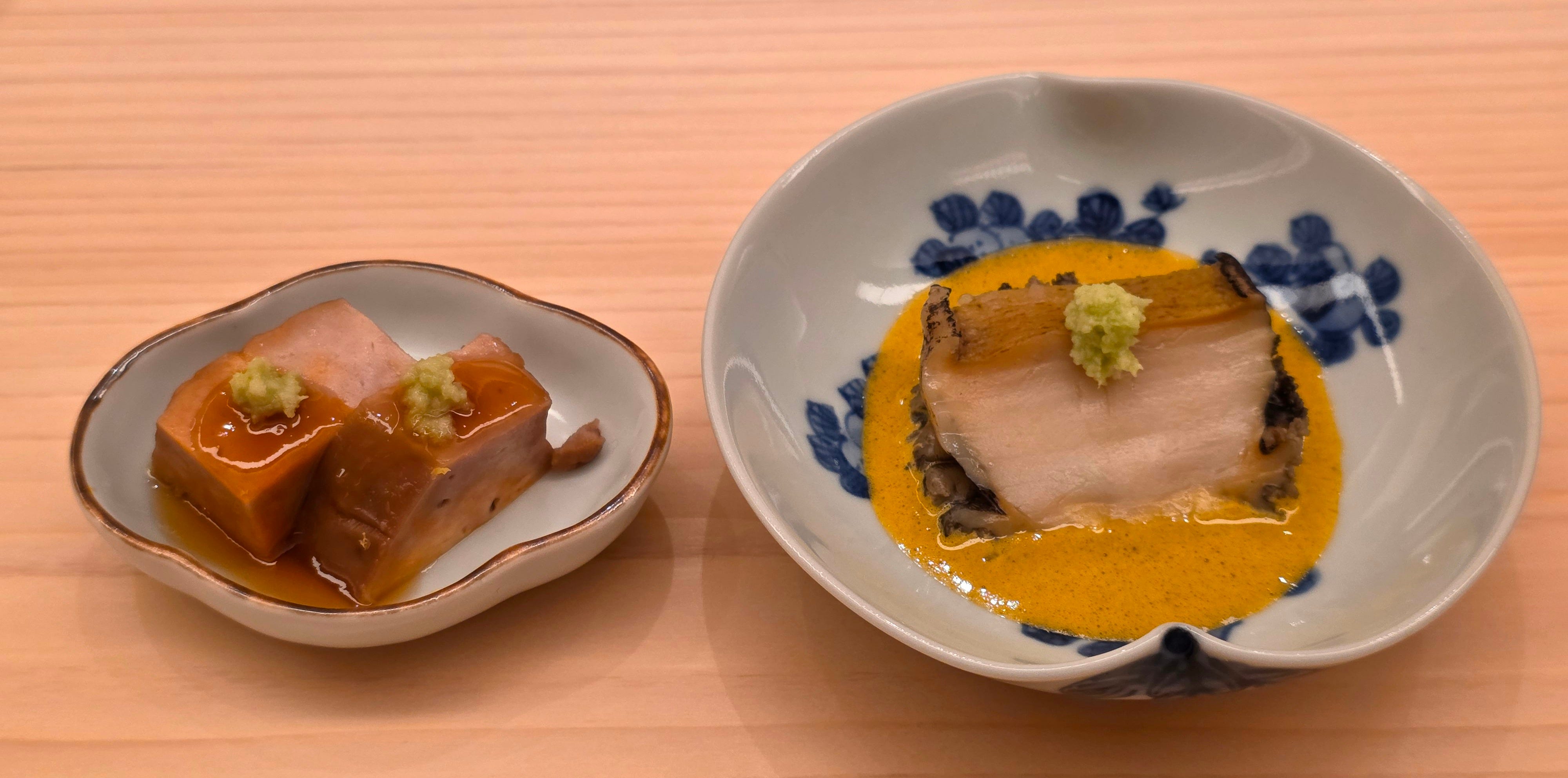 Finishing off the appetizers were two piece of monkfish liver, like foie gras in consistency, and a tender piece of braised abalone, served in the classical style, with the abalone liver sauce.