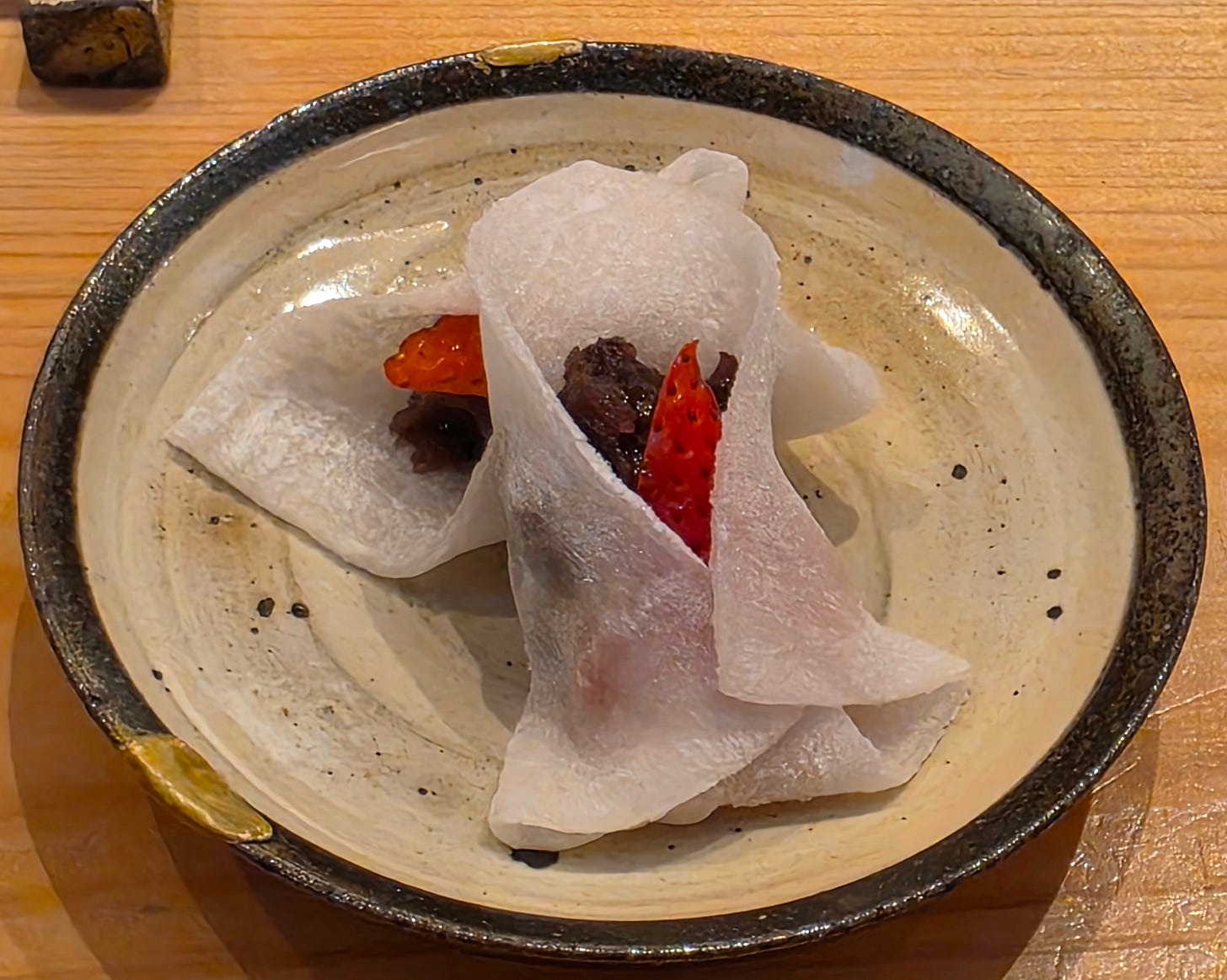 Finally, the dessert - slices of Japanese strawberries and mashed azuki bean wrapped in a daifuku mochi wrapping.