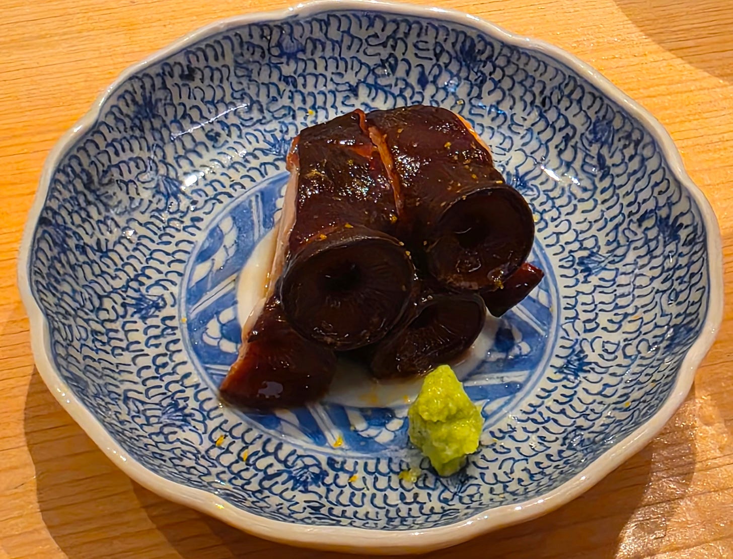 Moving quickly into one of the signature dishes at Sushi Shikon, two large pieces of red sake braised monkfish liver, topped with some of the braising liquid. With a rich, high-fat content and custard-like texture, monkfish liver is often considered the foie gras of the sea. The traditional fishing grounds for the monkfish are the freezing cold waters off the northern coasts of Japan, and the liver is a very seasonal dish best enjoyed in the deep of winter, when the monkfish has stored up all the fat in its liver.