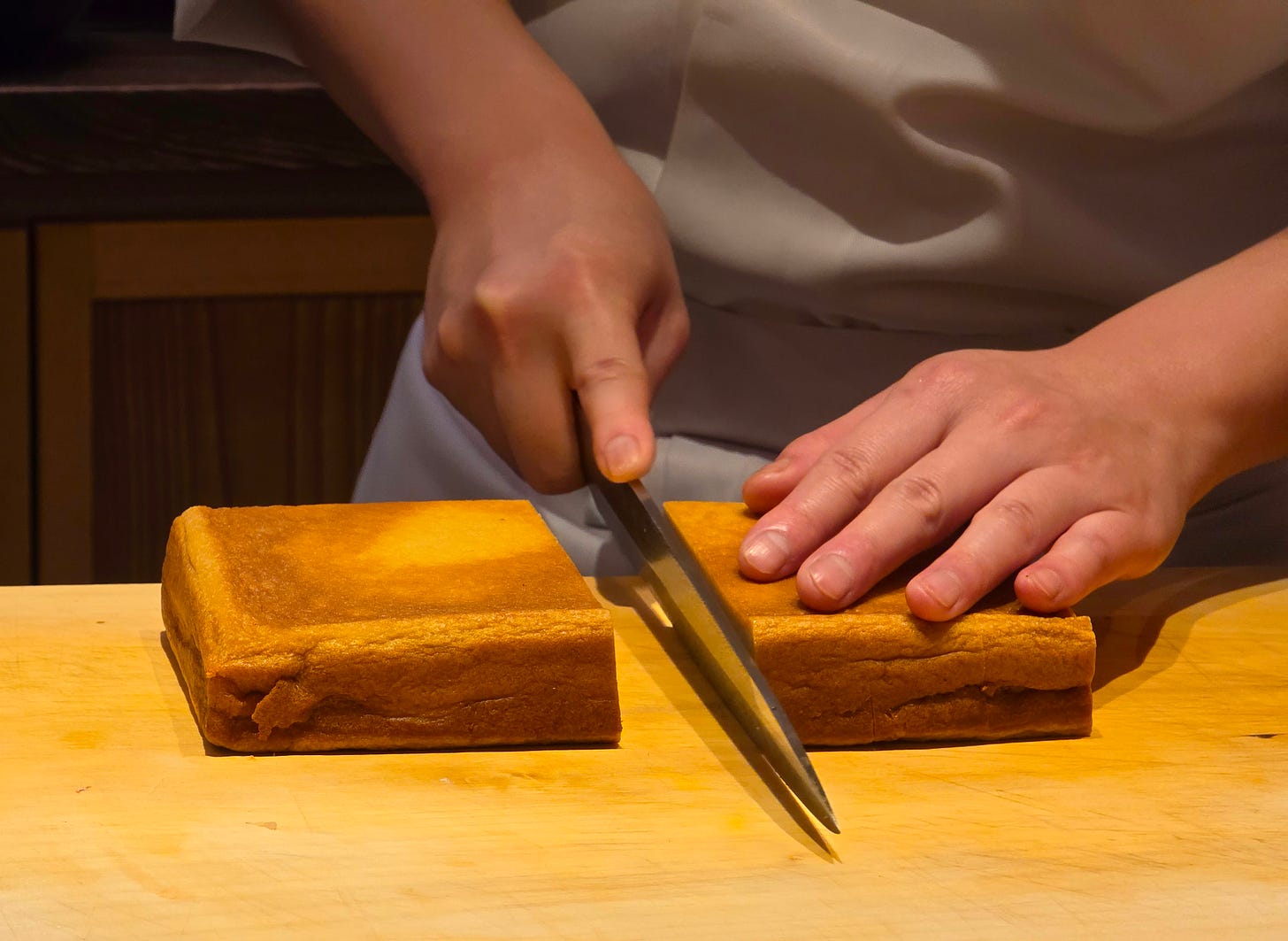The final piece, signifying the end n a omakase dinner, the Egg Castella. A dense, moist cake that is deceptively difficult to master and is a showcase of a chef’s ability to control texture, flavour and aroma simultaneously.