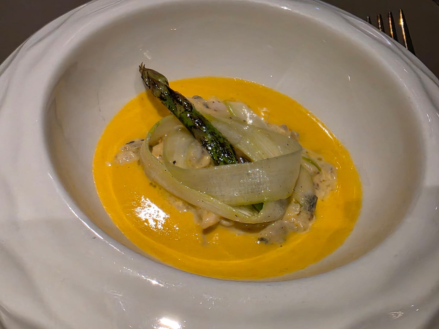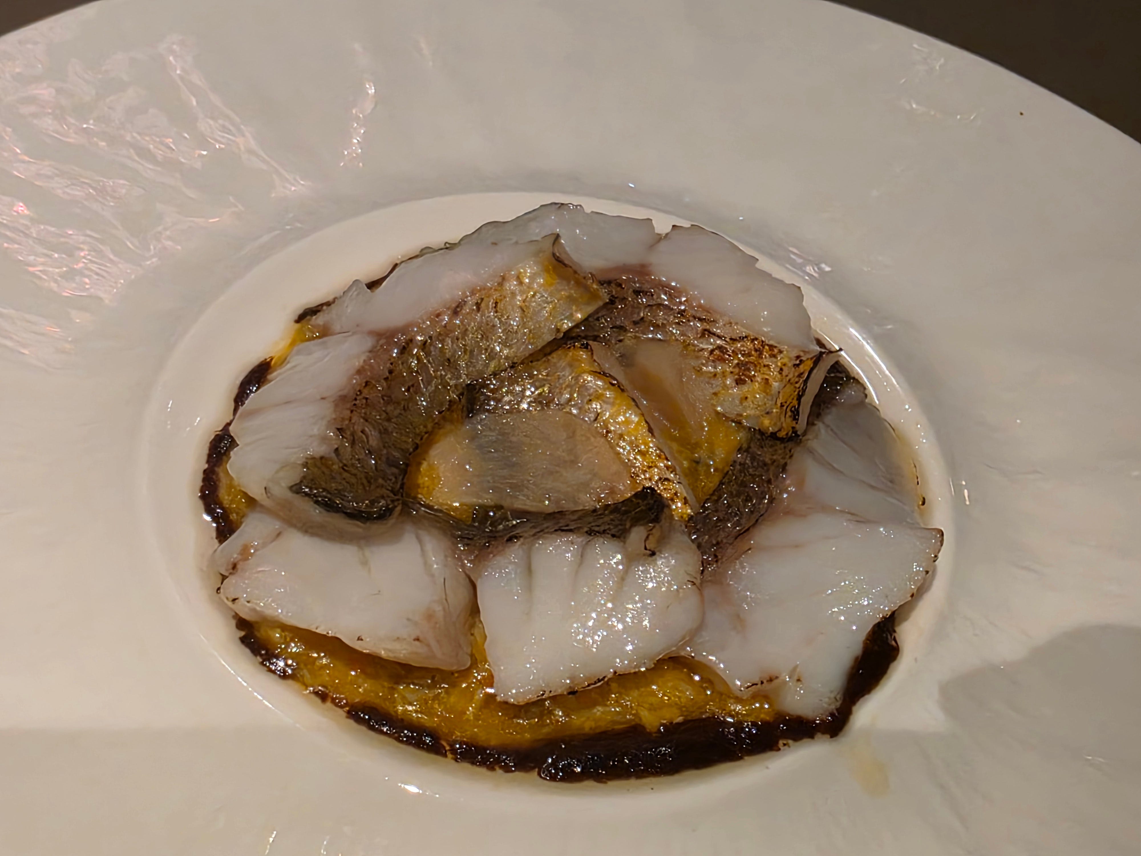 The first course was a classic combination of ginger and carrot flavours, served with shaved asparagus, oyster and hair crab roe.