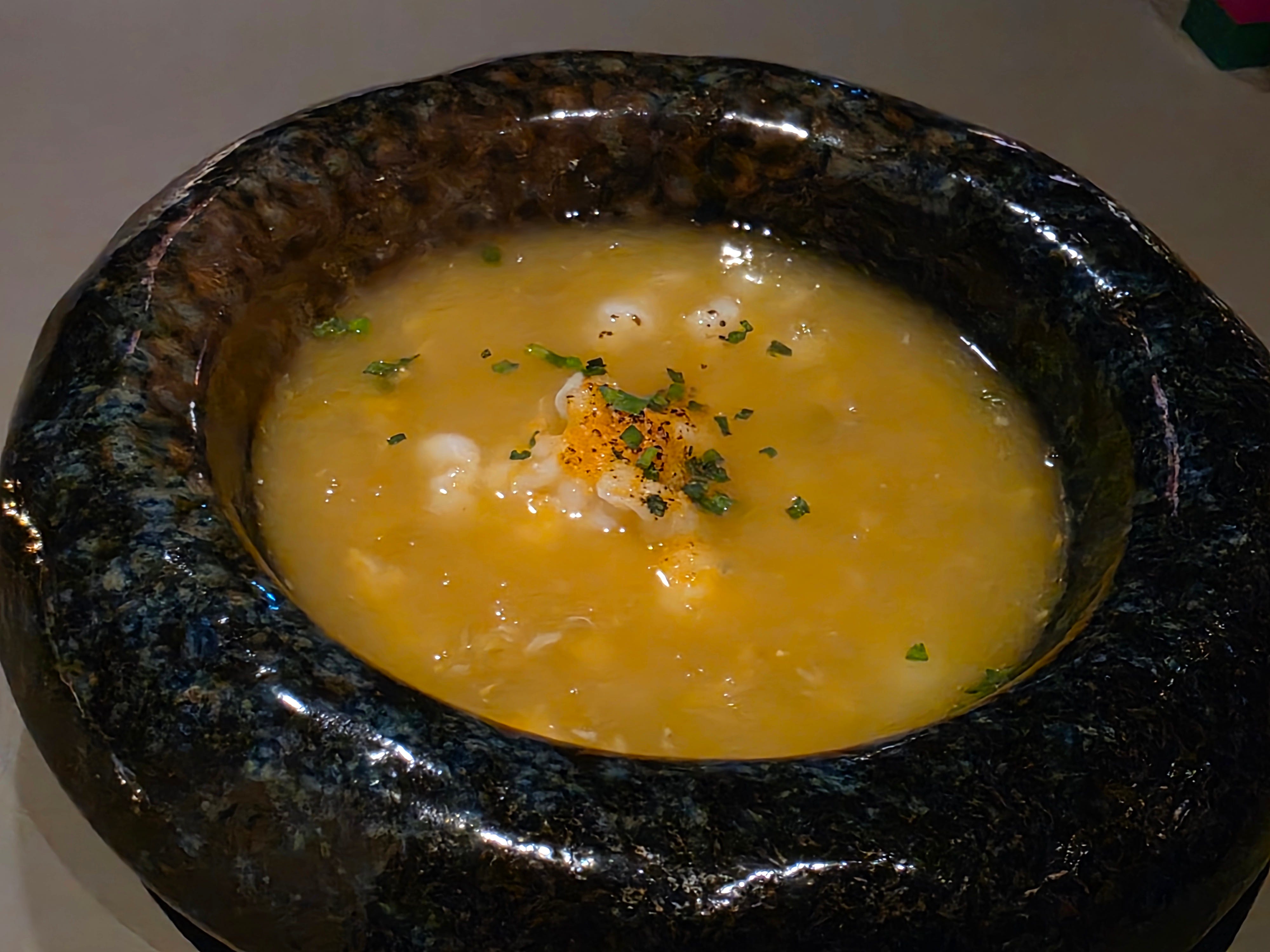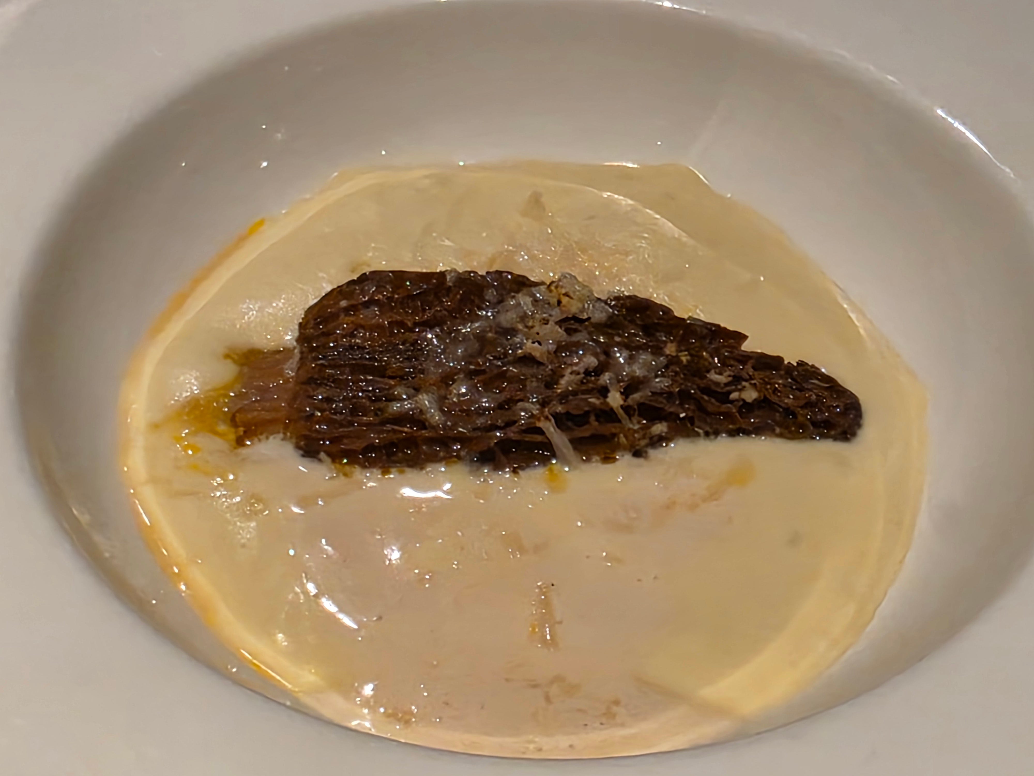 An amazing combination of hair crab meat and roe stuffed into a morel mushroom, surrounded by a Comte cheese and potato sauce. Rich, warm and filling on a cold night!