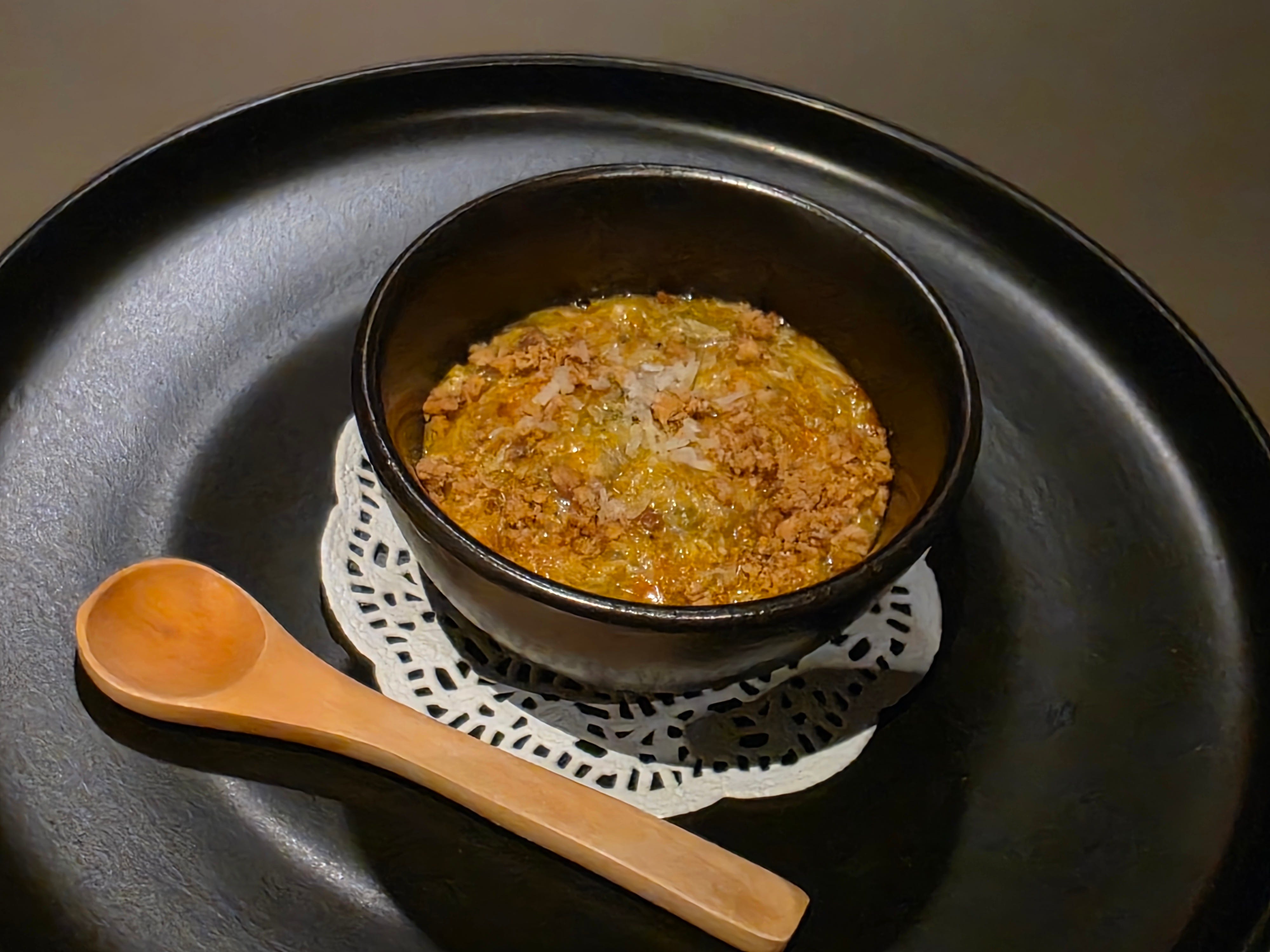 Next, a really neat hair crab, liver pate. Using oats, peanut kuzu pudding - bit of a neat combination of textures, flavours, that didn’t really work that well together.