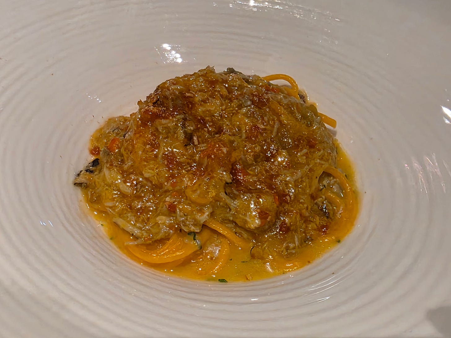 One of my highlights of the night, and a dish that really highlighted the star ingredient, a hairy crab tagliolini topped with hairy crab roe, served with a bit of 50 year-aged vinegar. Traditionally, hairy crab is always served with aged vinegar in Shanghainese cuisine, and adapting the flavour profile with pasta was a big hit!