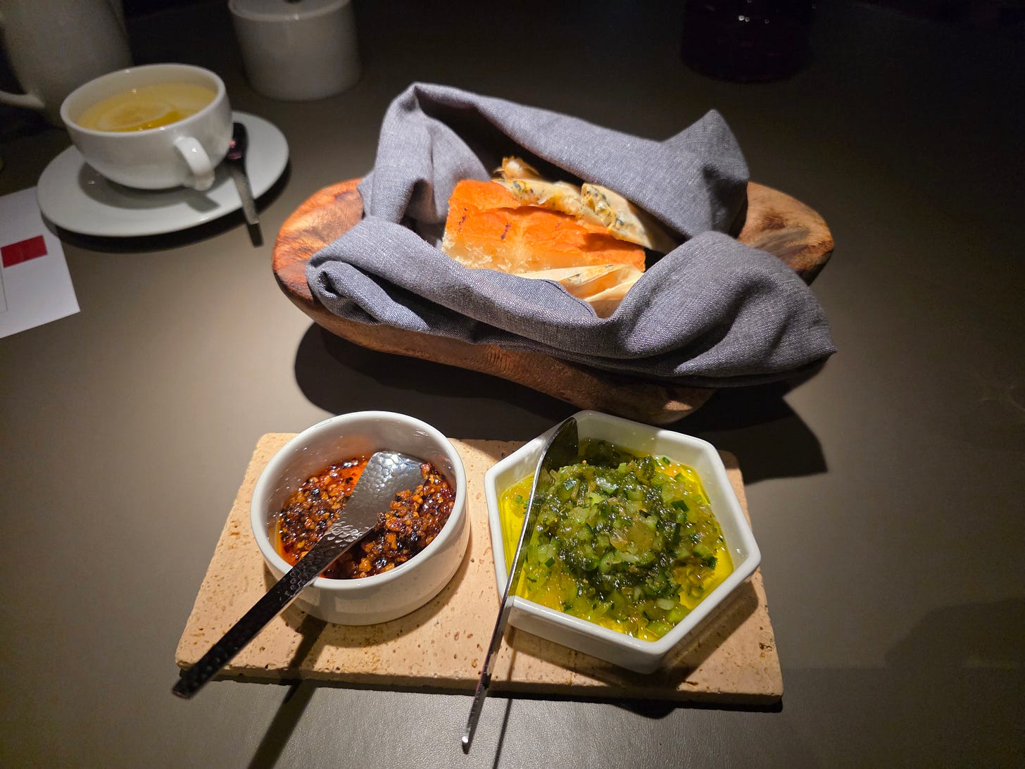 A different take on the bread course, with a Chinese flavour, serving the bread with something that tasted a bit like an XO sauce, and a ginger, green onion and chive sauce. Both of which normally served with chicken, not bread.