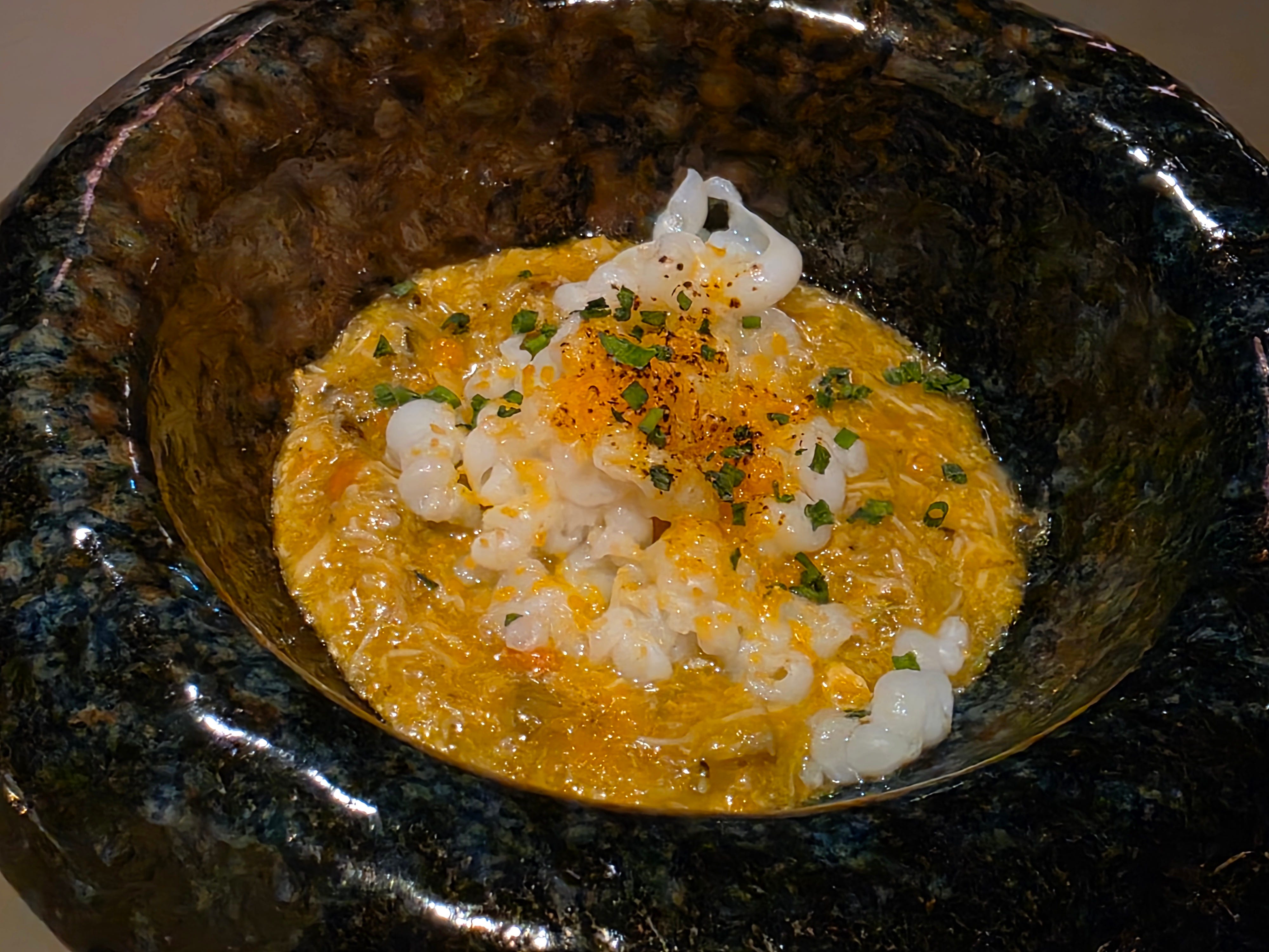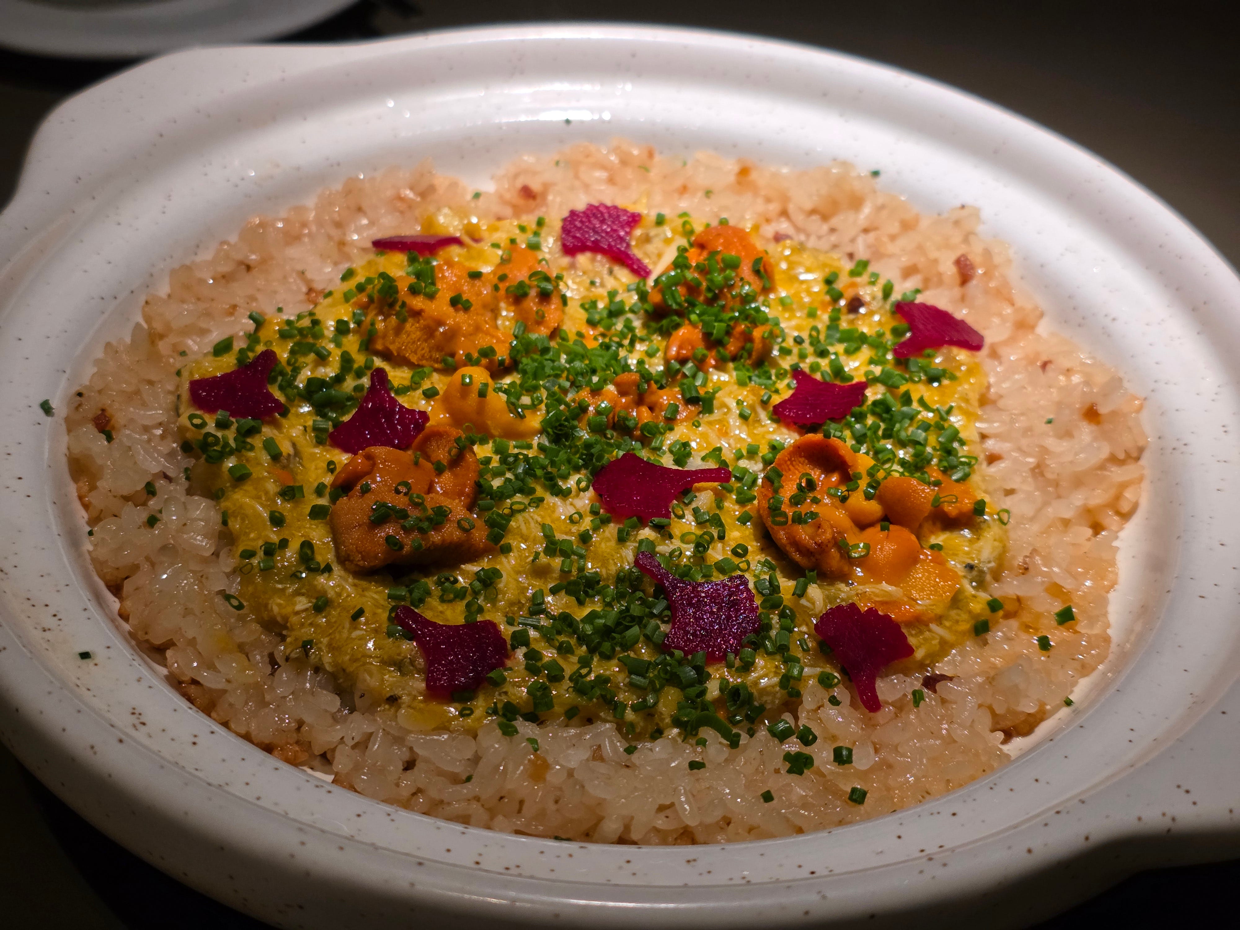 The biggest hit of the night, a crispy claypot rice topped with hairy crab roe, uni and sliced beetroot and chives. A very thin layer of rice, maximizing the browned crispy layer of rice touching the claypot while cooking. This was an optional supplement that was absolutely worth it. The single best dish of the night, and worth revisiting for this dish alone!