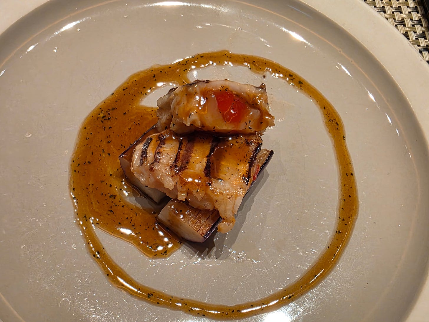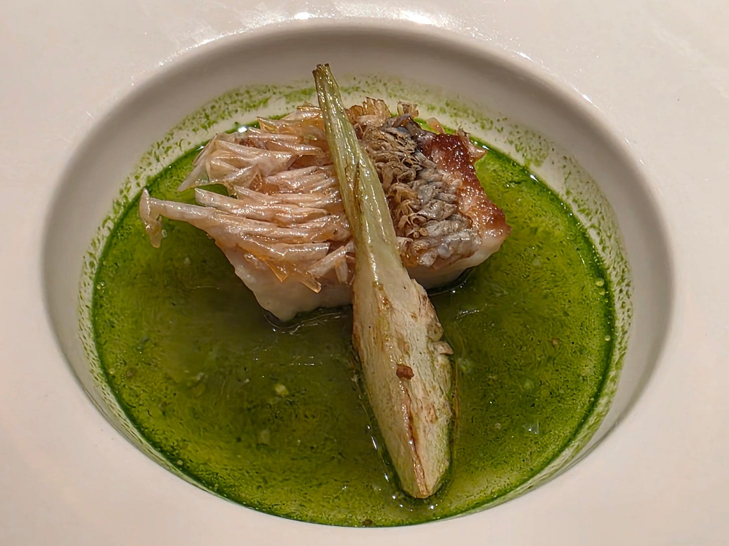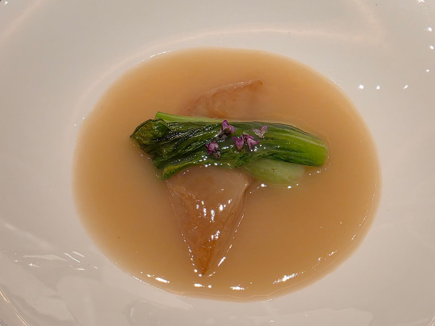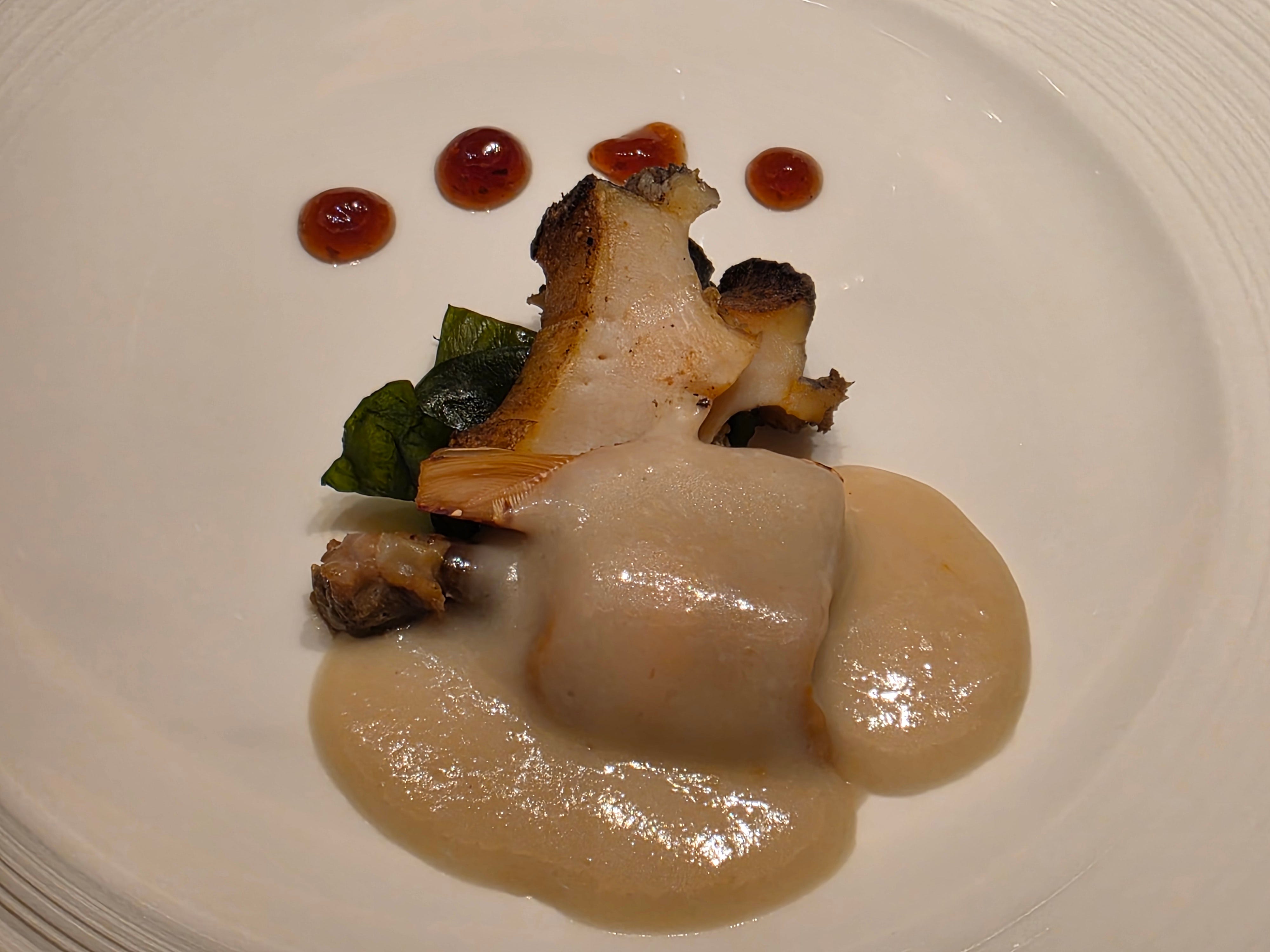 A much stronger dish followed. A pan-fried piece of tilefish arrived with remarkably crisp skin, served in a clam and basil consommé. On paper, basil feels slightly unconventional in this format, but the dish worked. The fish itself was excellent, and the broth gave it brightness and fragrance without overwhelming the delicacy of the flesh. One of my highlights of the evening.