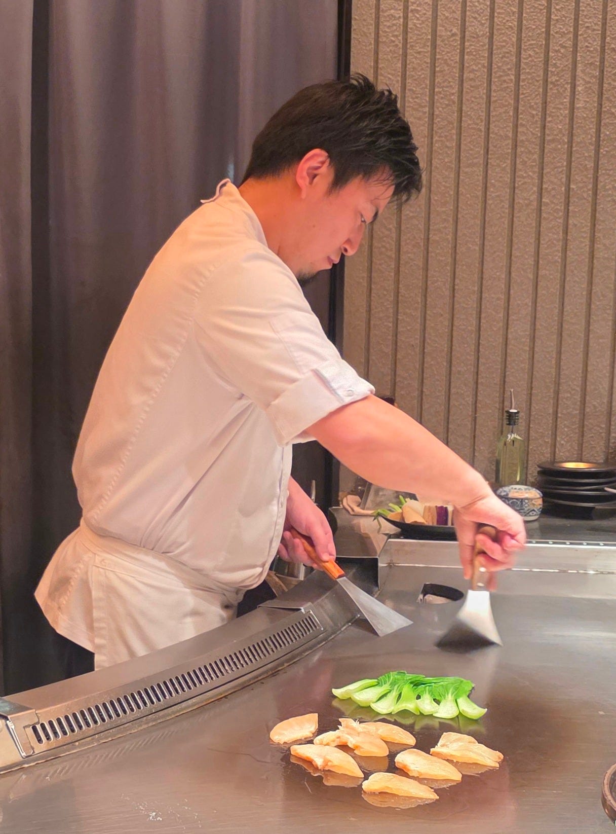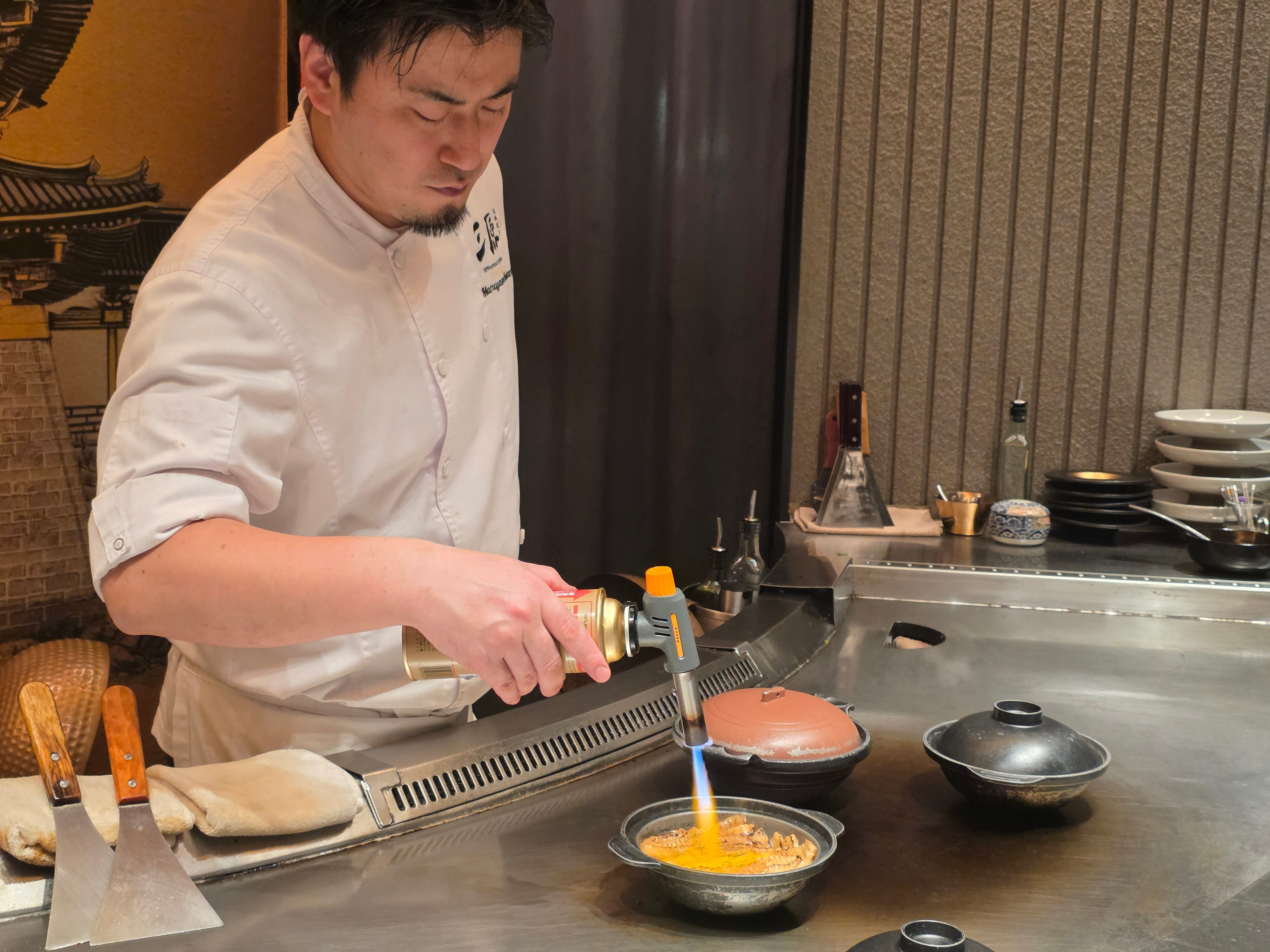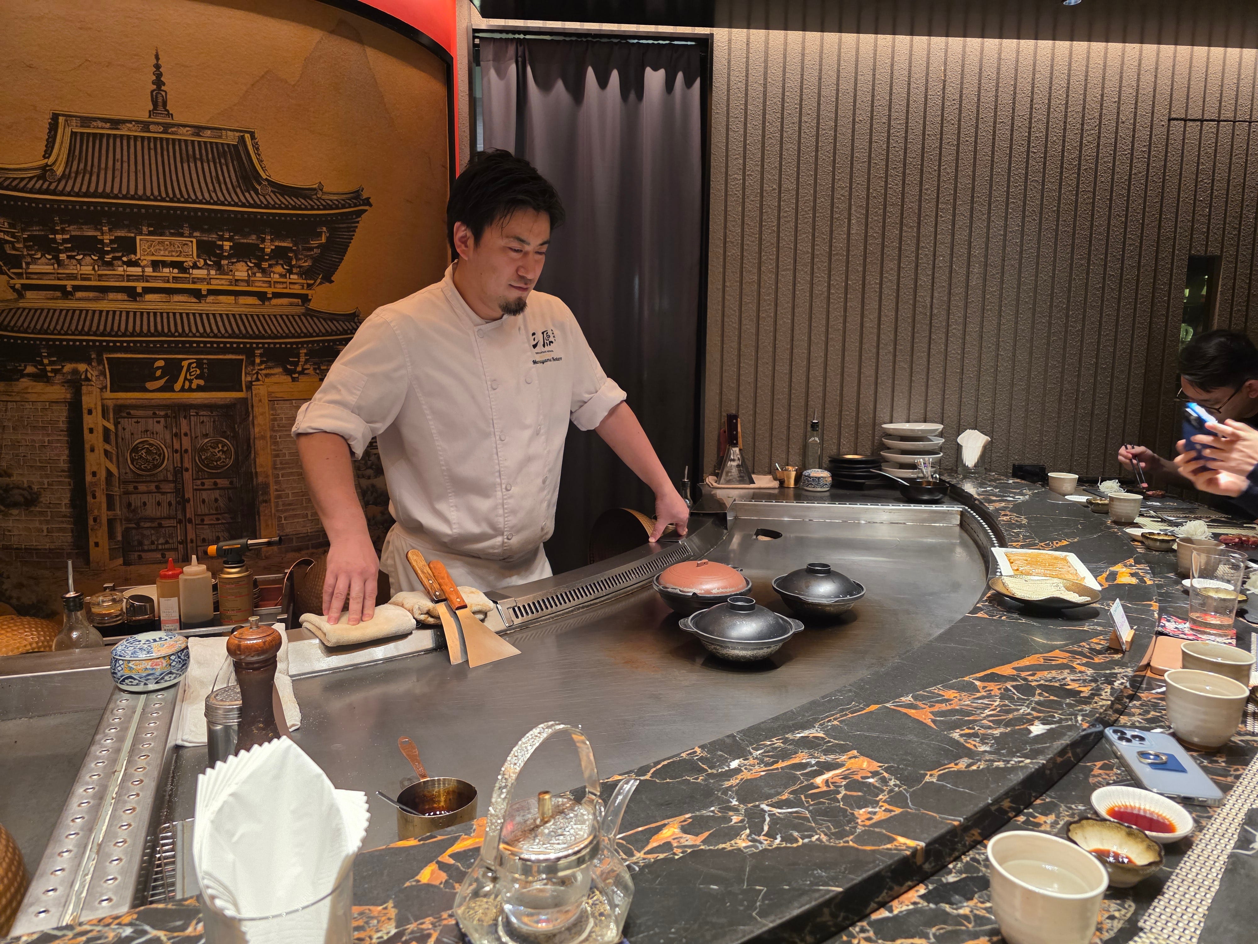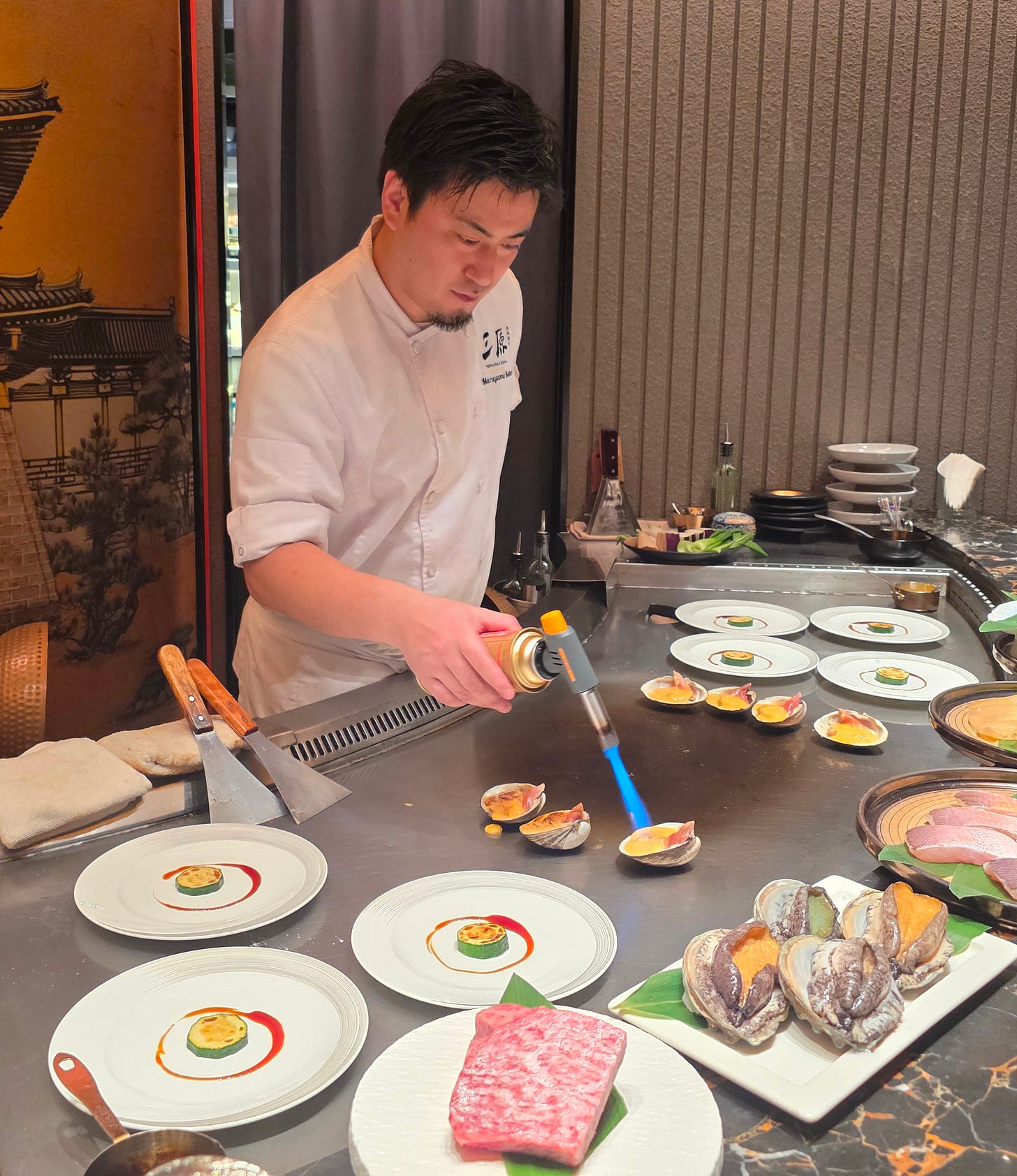 The chef behind the restaurant is, of course, Terufumi Mihara himself. The place carries his name, and the whole concept feels unmistakably personal. Each service is said to run under his close supervision, and the menu reflects his broader philosophy: premium Japanese produce, prepared with the precision and sequencing of kappo, but filtered through the live-fire steel surface of teppanyaki. That hybrid is really the whole point. This is not just beef and seafood on a hot plate. It is trying to create a more layered, seasonal, chef-driven teppanyaki experience.