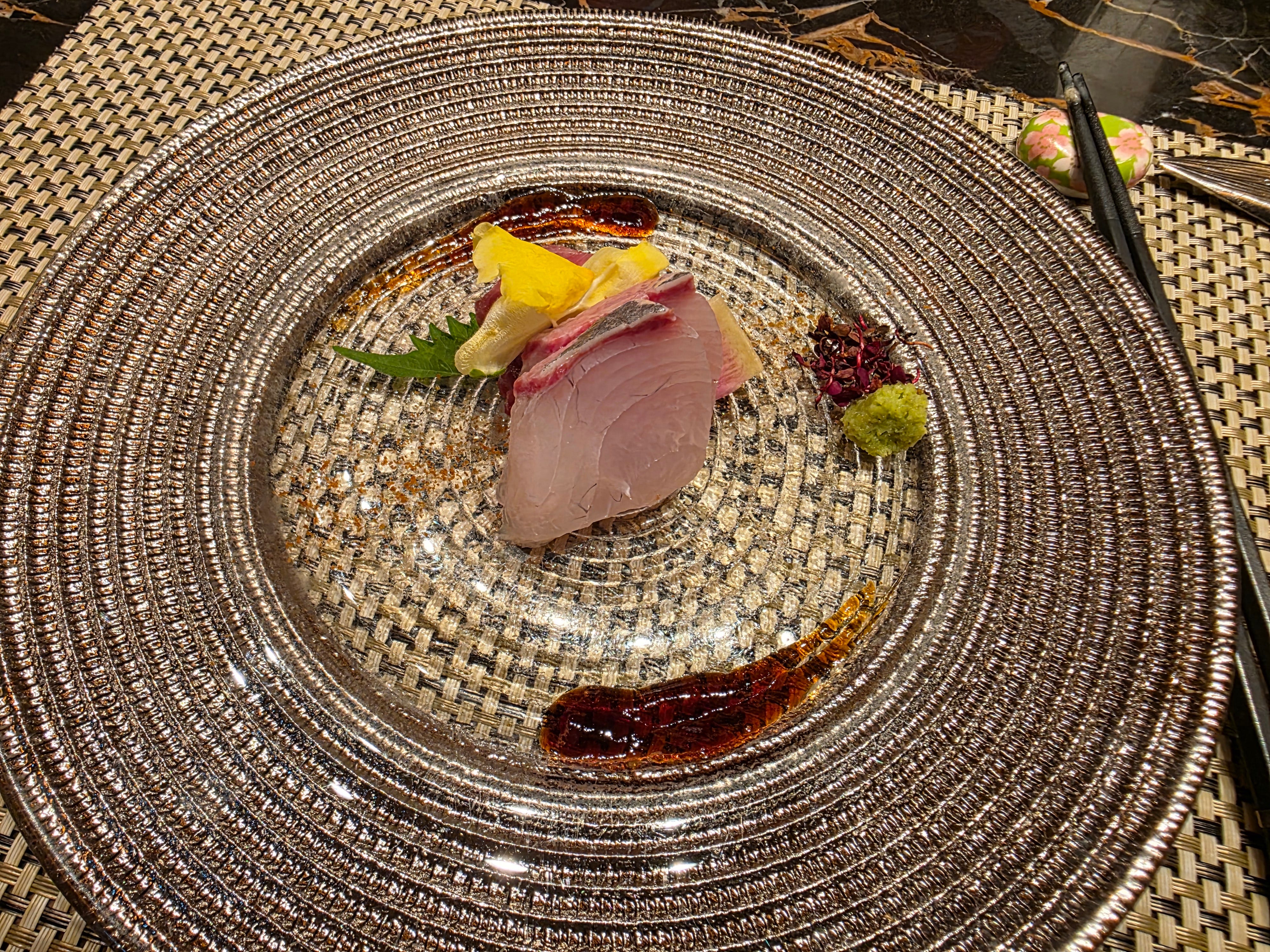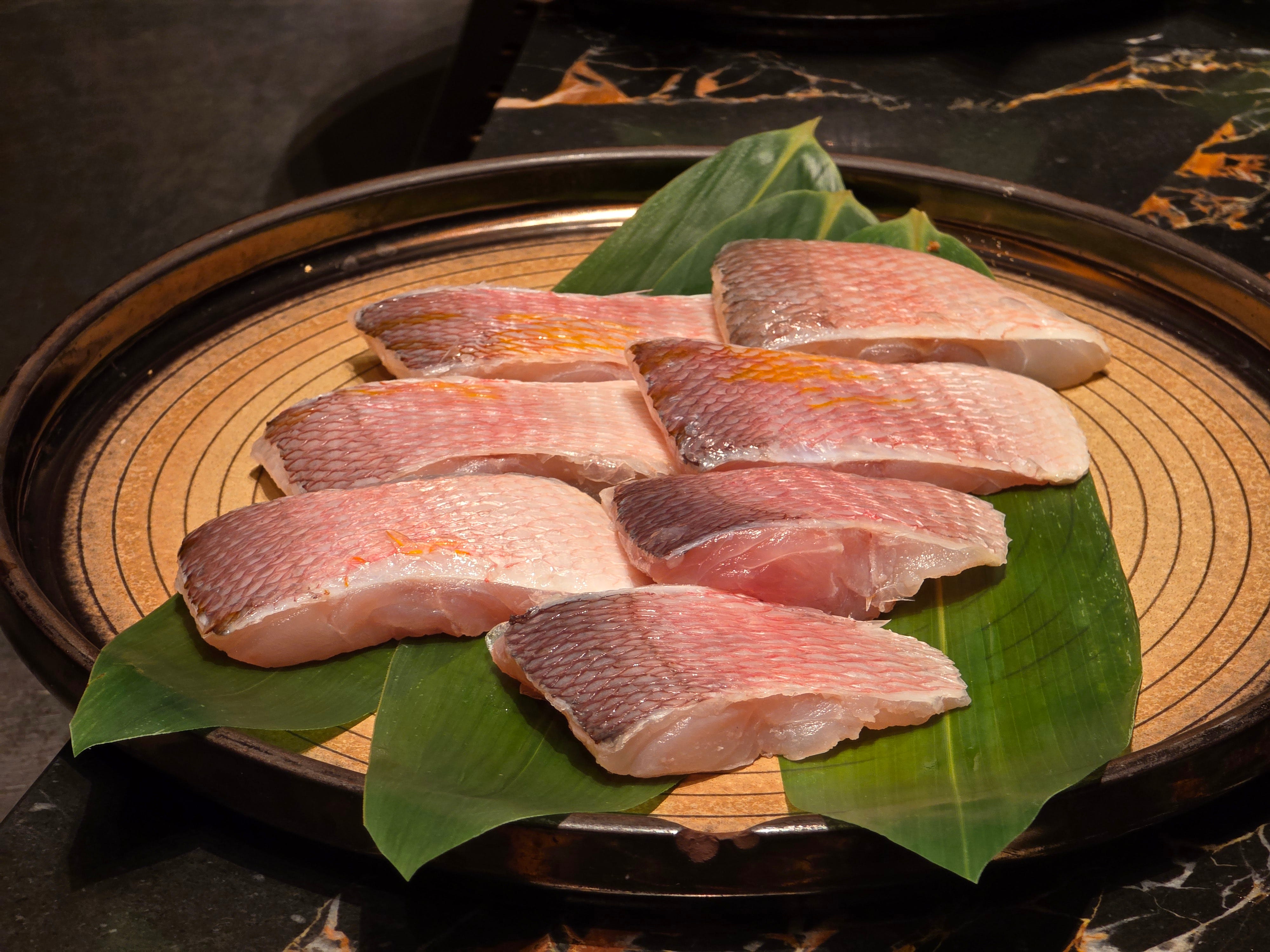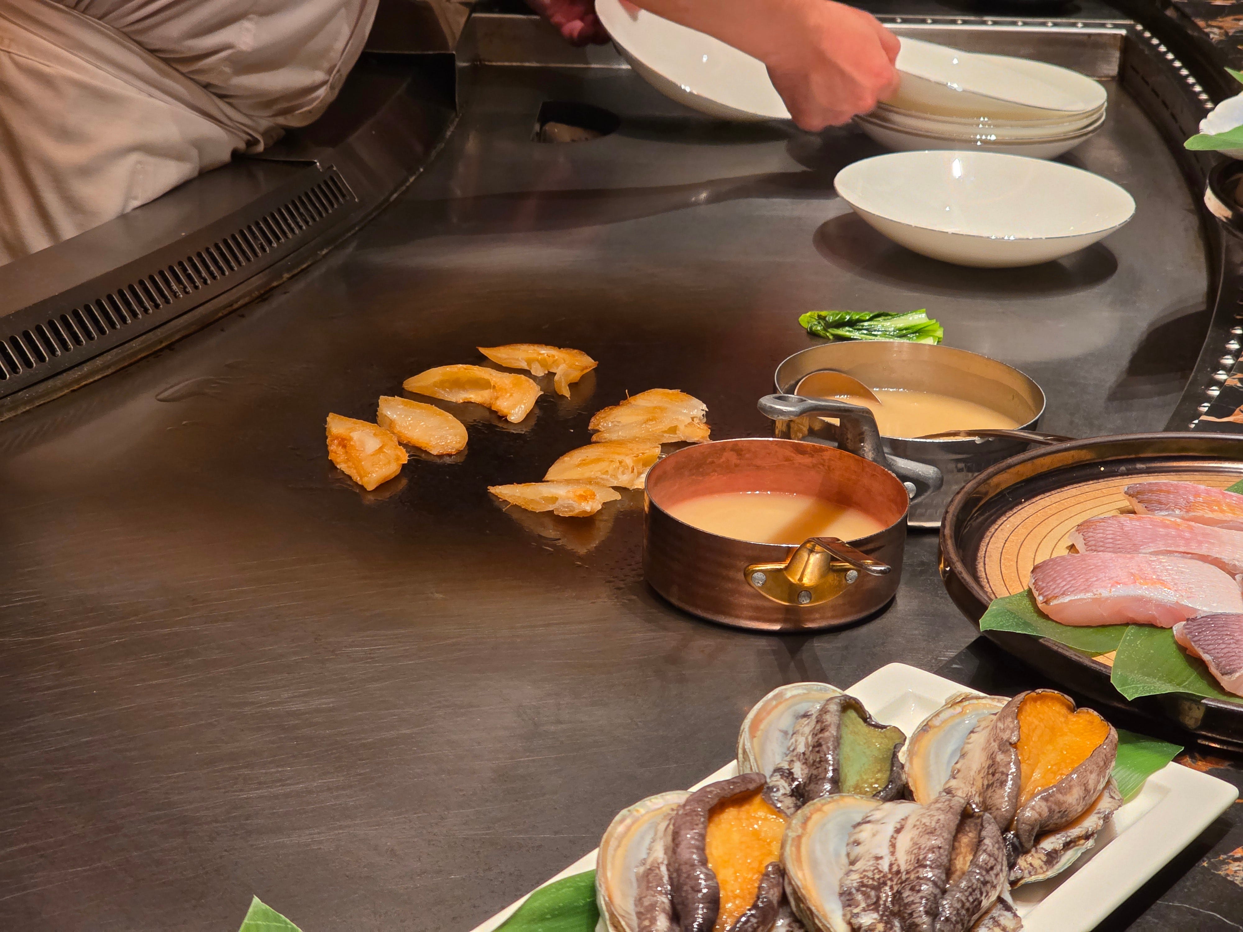 The sashimi course was yellowtail with a jellied soy sauce, a restrained and elegant start before the teppan portion of the meal really began. After that came one of the more enjoyable rituals of this style of restaurant: the presentation of the raw ingredients before they were cooked. Abalone, amadai, rehydrated shark fin, mantis shrimp, and beautifully marbled A5 wagyu all made their appearance one by one, each ingredient laid out like a promise.