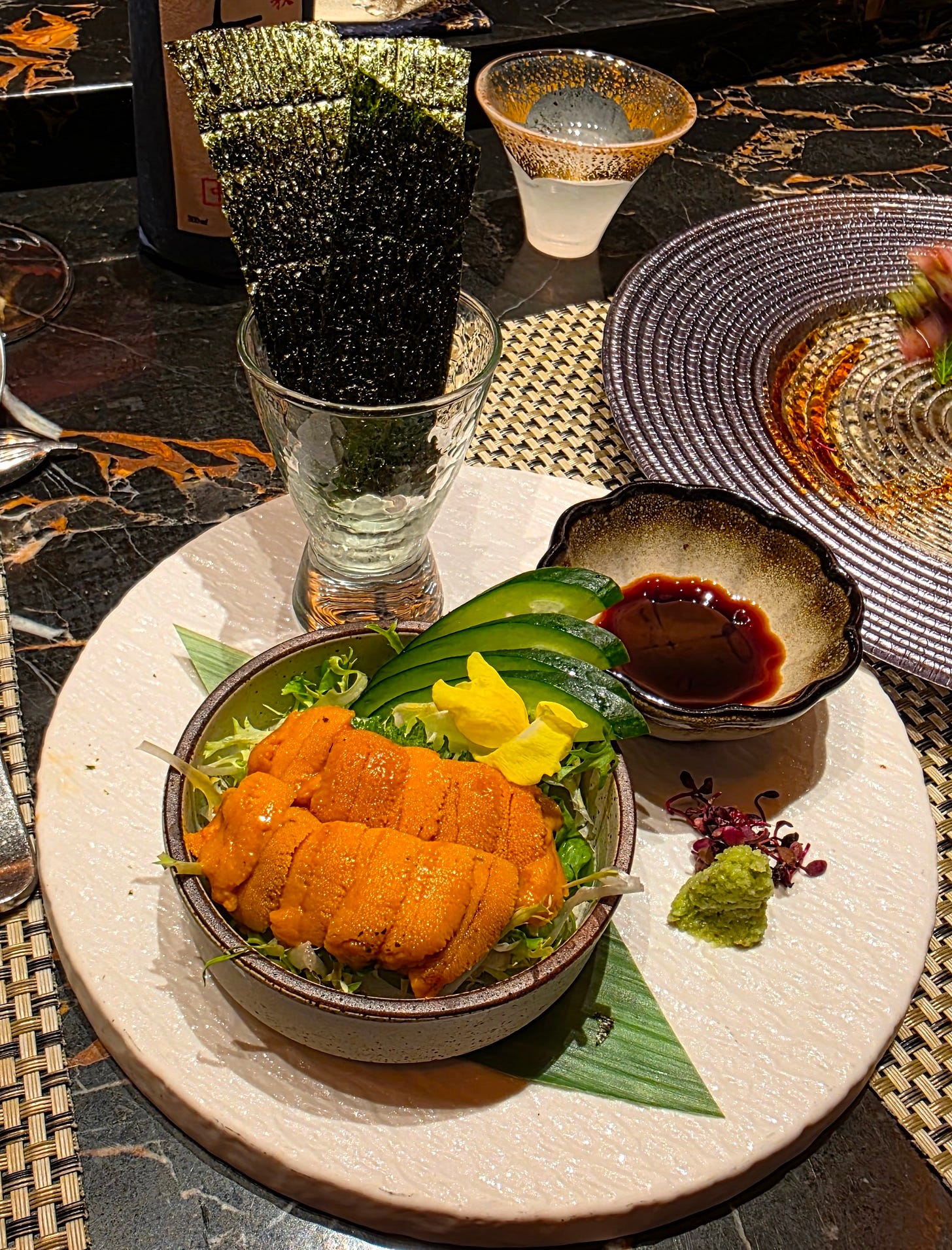 We also added an optional supplement of Hokkaido sea urchin, served in a deconstructed uni gunkan format. This was indulgent in exactly the way uni should be, vivid in colour, sweet, creamy, and deeply marine. A little obvious perhaps, but no less enjoyable for that.