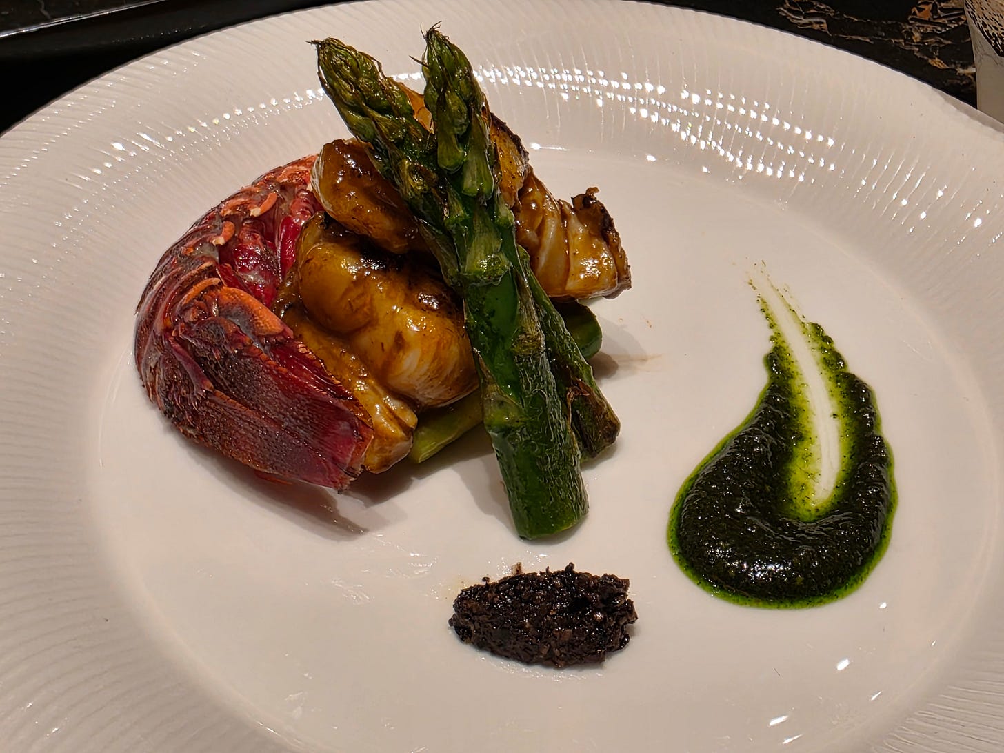 The lobster, grilled in soy butter and served with basil pesto and tapenade, was similarly a little underwhelming. The seasoning combination was interesting enough, but the lobster itself was slightly overcooked and chewy, which is hard to forgive when lobster is meant to be one of the centrepieces.
