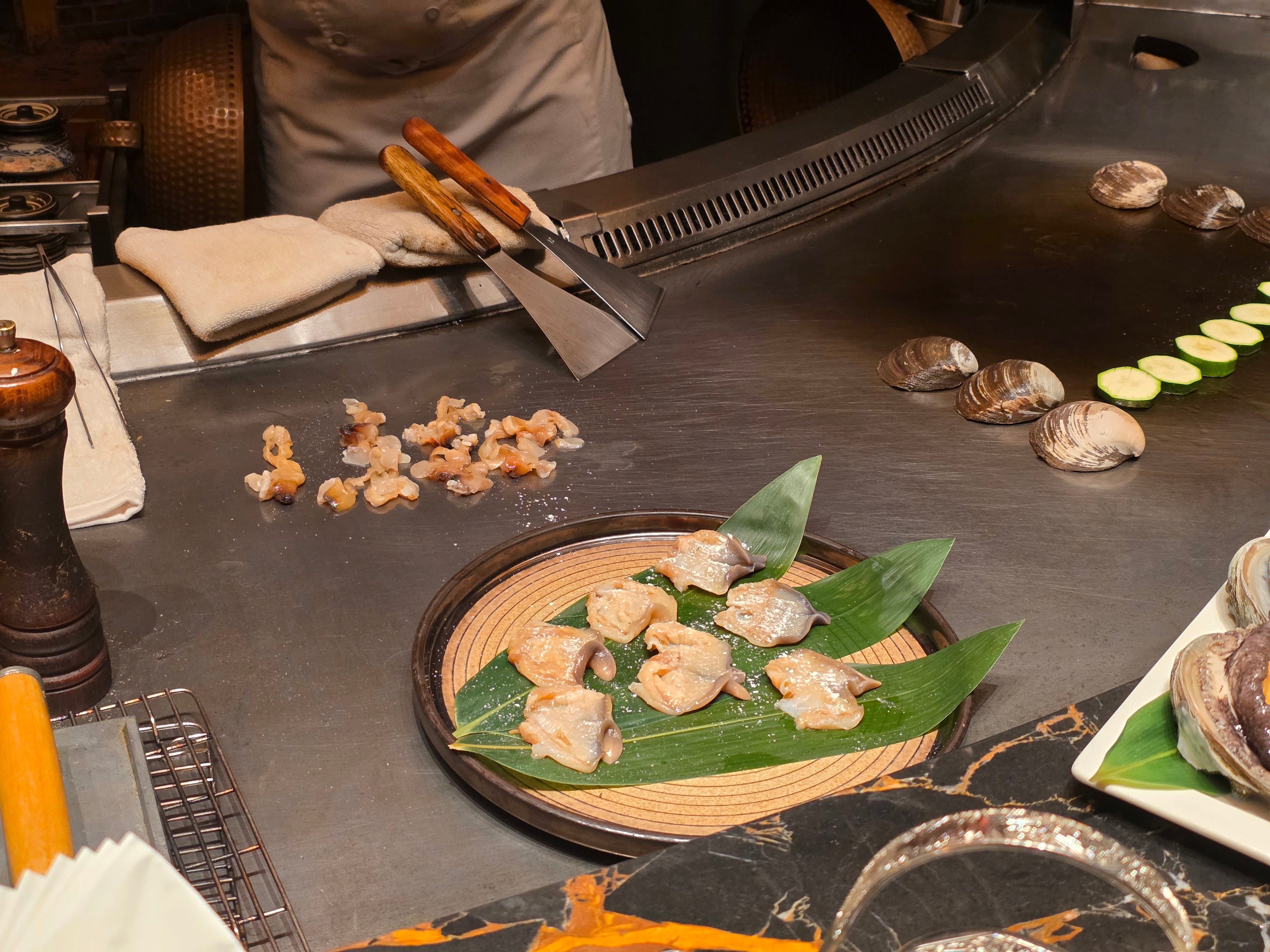 Tucked away inside a fairly nondescript office building in Causeway Bay, the restaurant itself is intimate enough that our group of seven took up half of the 14-seat counter. The seats are arranged in a semicircle around the central teppan grill, which gives the room a good sense of focus without feeling cramped. It is a small room, but not a severe one. The atmosphere felt polished and quietly modern rather than formal, and the scale of the place suited the style of cooking.