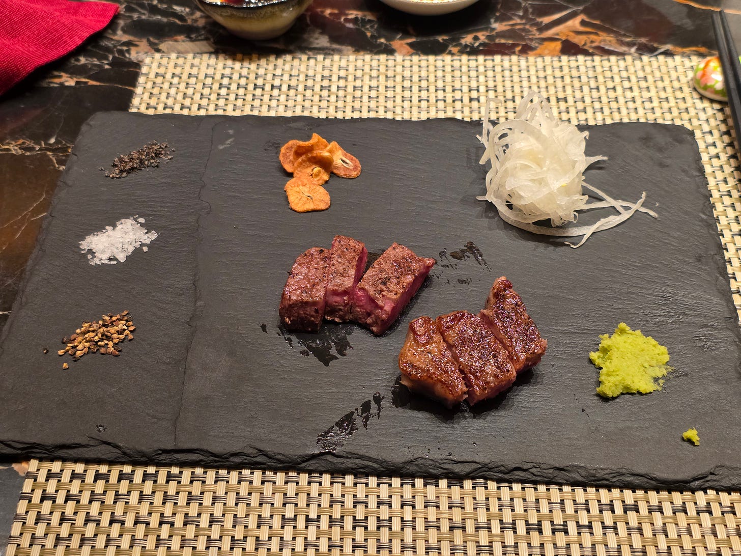Before the beef course, the chef presented two cuts: an A4 wagyu sirloin and an A5 “drunken” tenderloin. I appreciated that they specifically source A4 rather than A5 for the sirloin, recognizing that too much fat in that cut would become cloying. It is the sort of decision that suggests someone is thinking carefully rather than merely chasing labels. The beef arrived properly cooked, served with garlic chips, wasabi, and three different salts. The portion size was also exactly right. With wagyu, generosity can become a burden quite quickly, and any larger serving would have tipped from indulgent into exhausting.