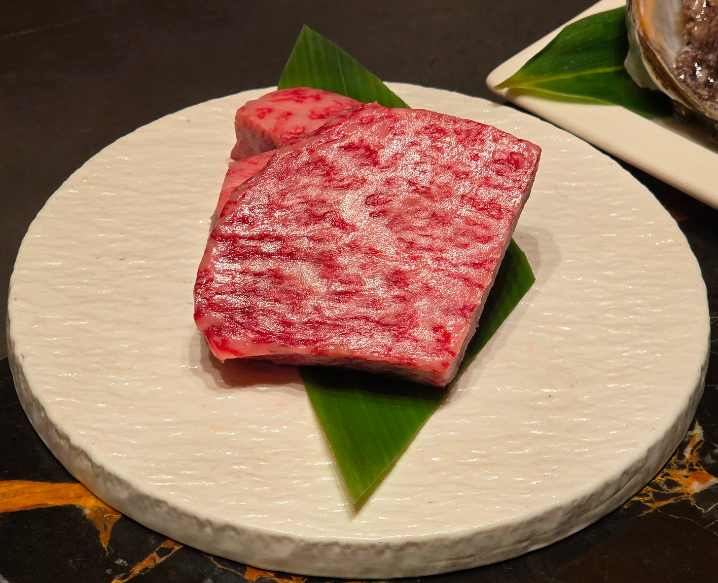 Both arrived perfectly cooked on the plate with garlic chips, wasabi, and three kinds of salt. The portion was just right; the fattiness of the beef makes it extremely filling, and any more would have been unmanageable.