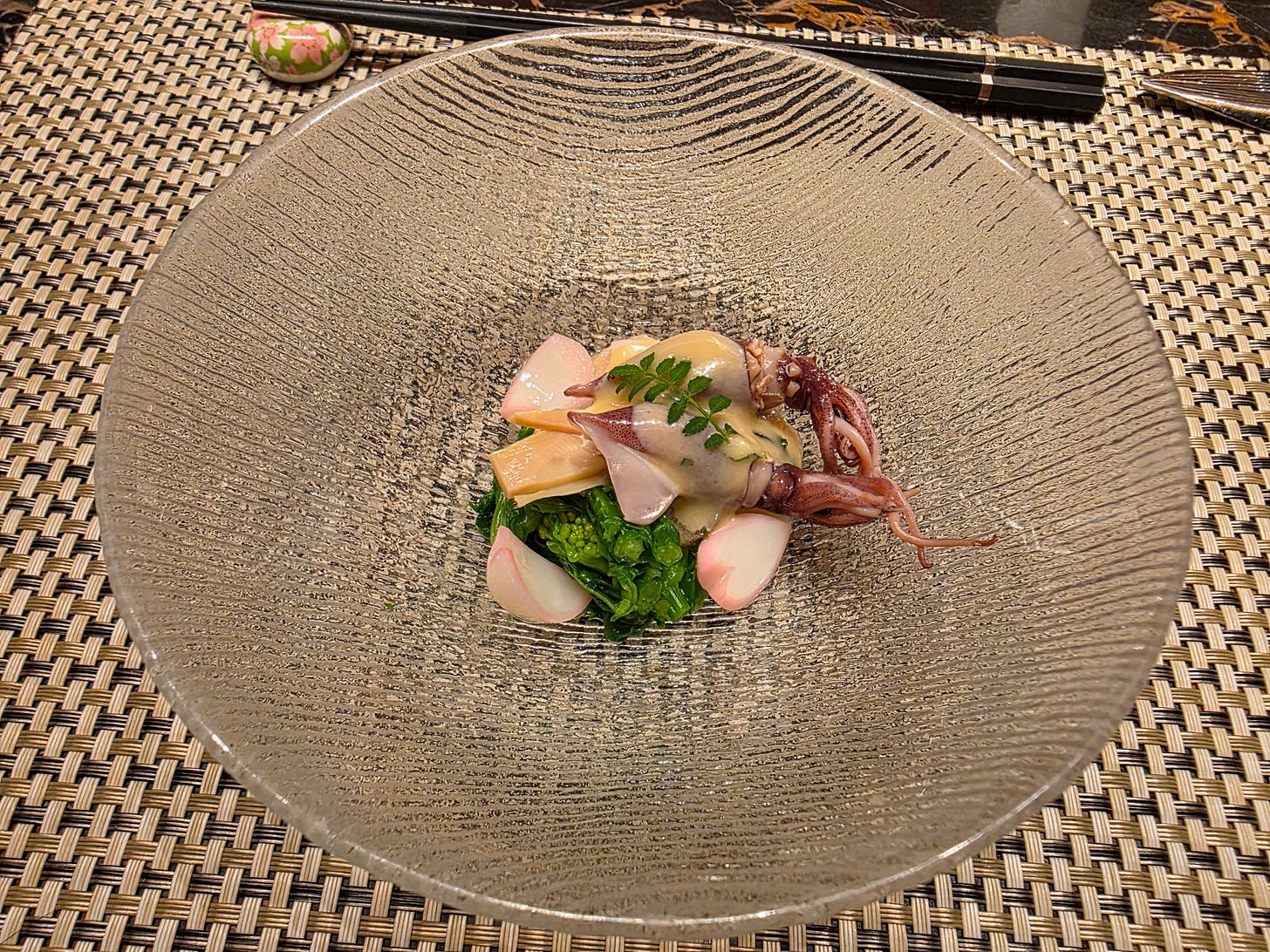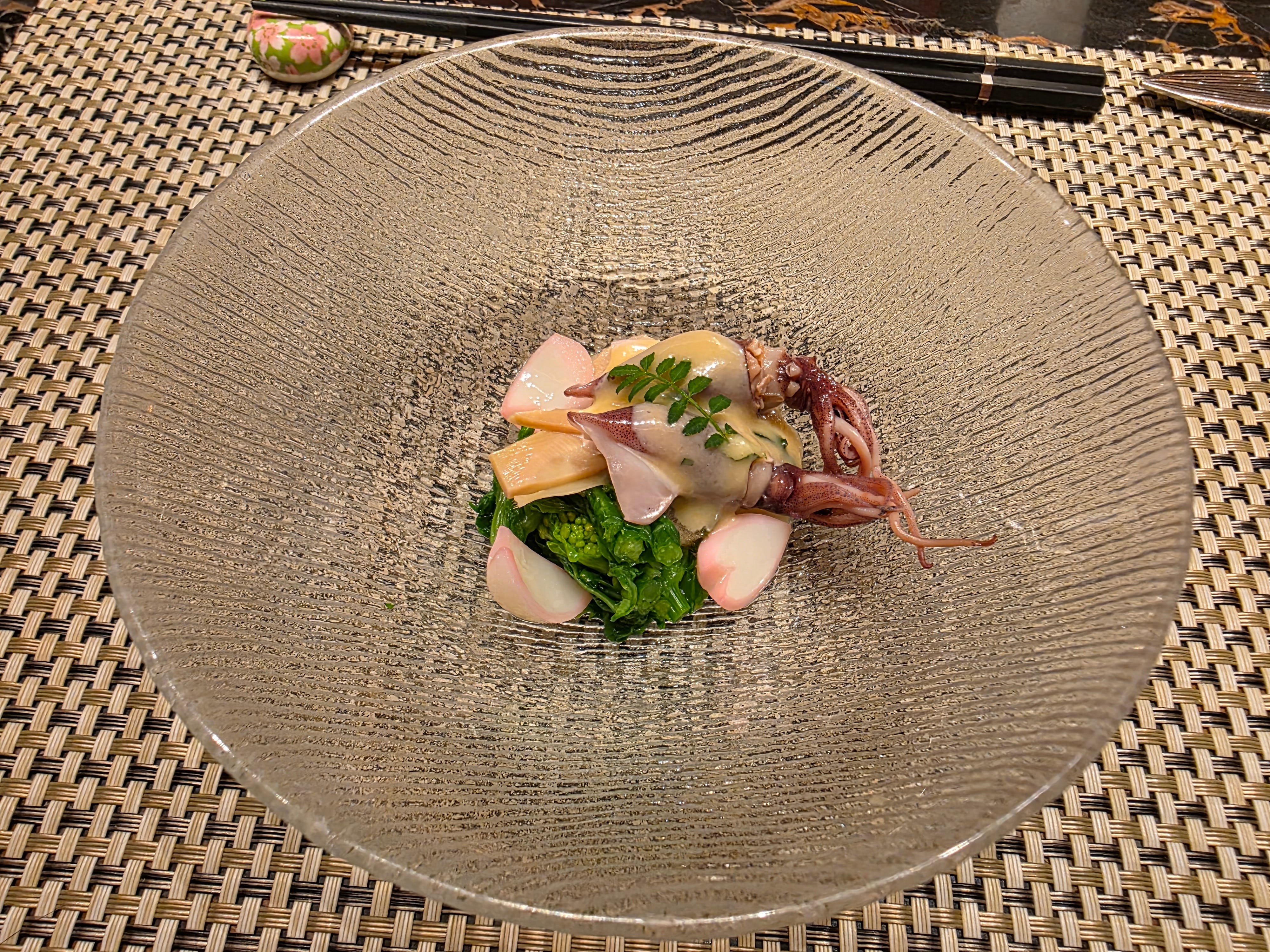 The meal began with a firefly squid canapé, a neat opening bite. Firefly squid can turn unpleasantly slimy very quickly if mishandled, but this one was fresh and clean, paired with broccolini in a way that let the sweetness of the squid show through.