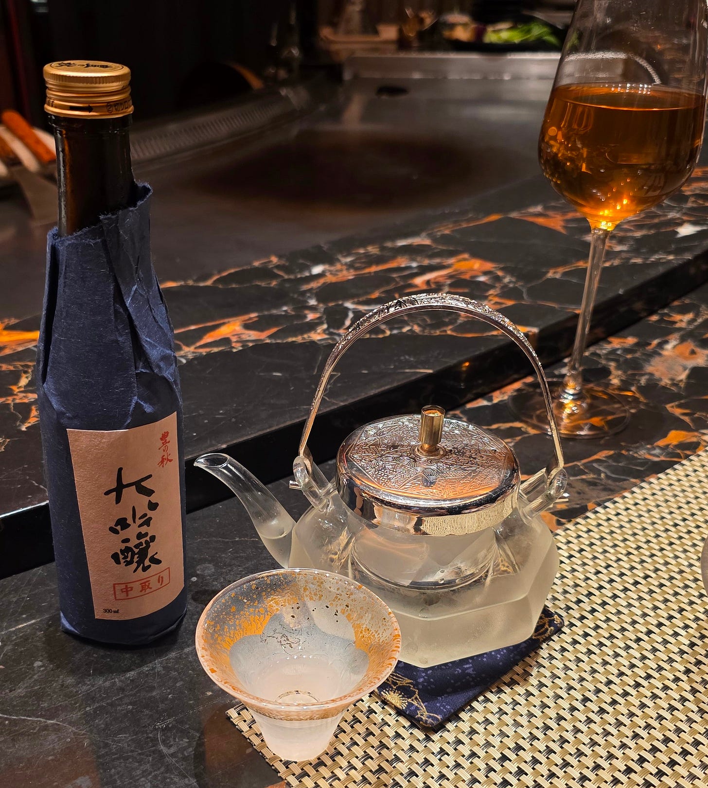 A small bottle of sake appeared at some point early in the meal, though I confess I can no longer remember what exactly what it was or any tasting notes. That may say more about the evening than the sake.