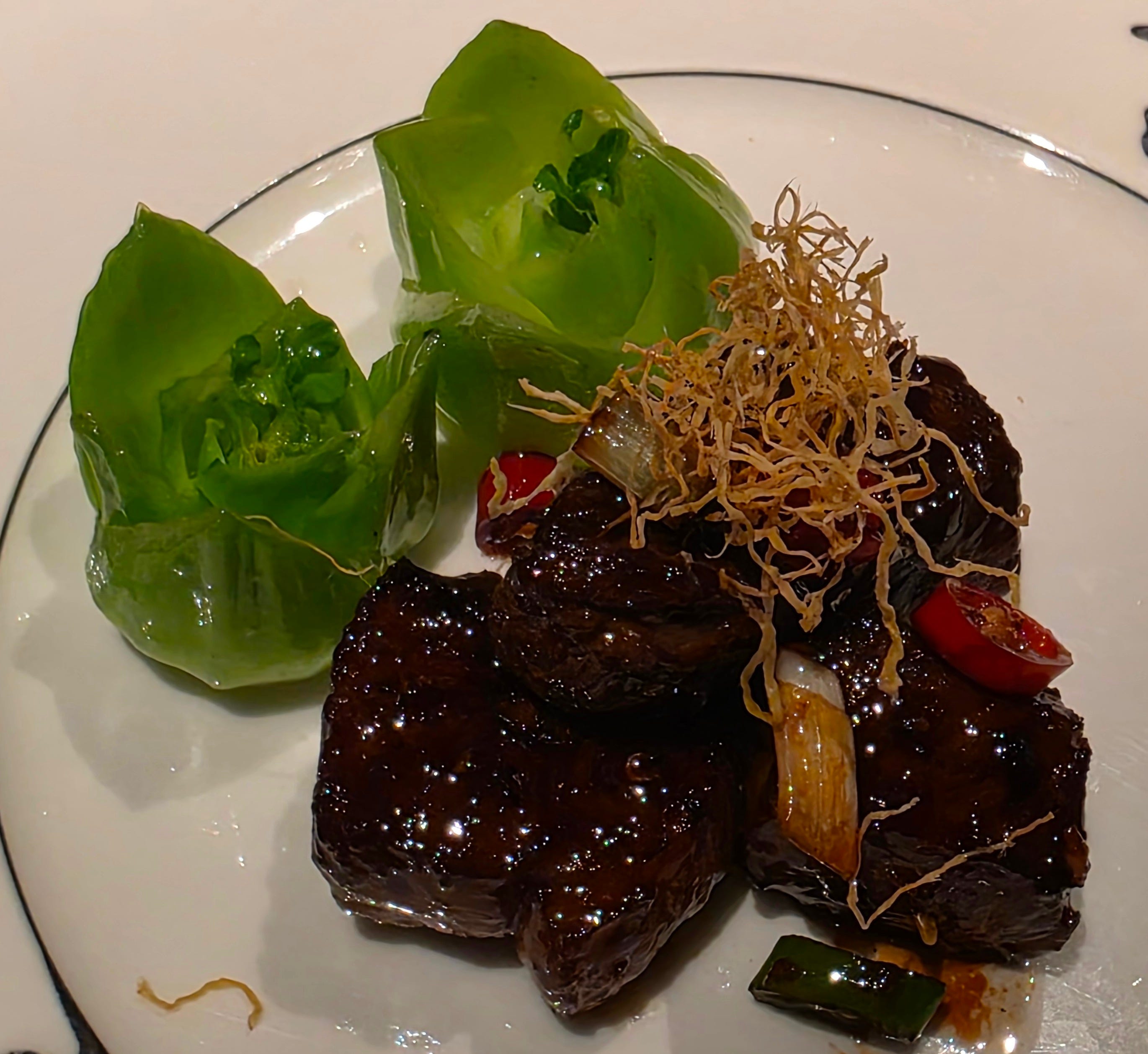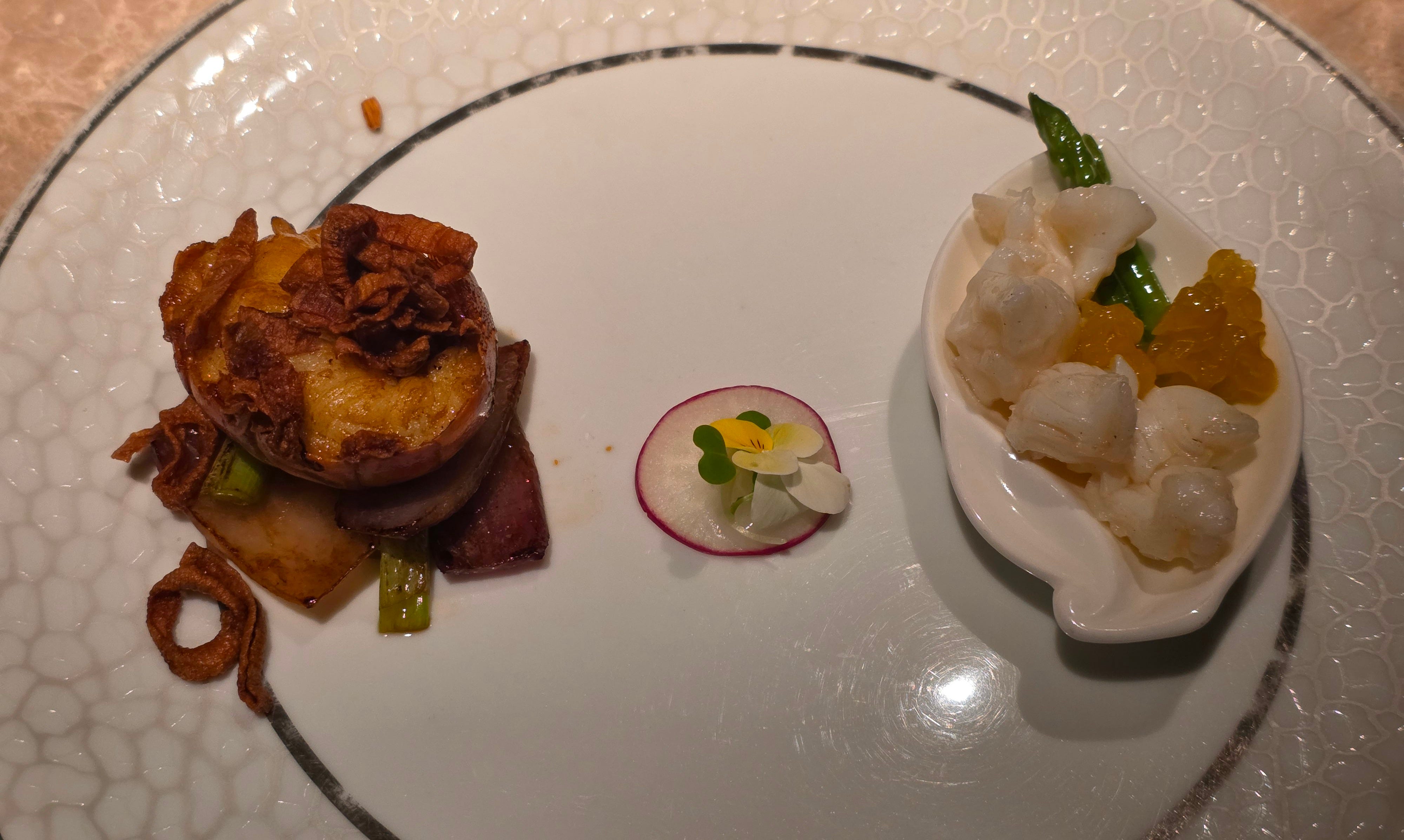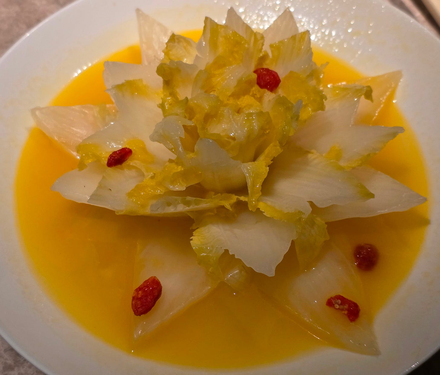 One of the neater dishes of the night was a traditional preparation of poached Tianjin cabbage in rich chicken broth with wolfberries. The cabbage had been carefully carved into the shape of a flower. The dish itself was elegant and soothing, and a reminder that high-end Cantonese cooking often reaches its most sophisticated expression not through extravagance, but through taking a humble ingredient and treating it with extraordinary care.