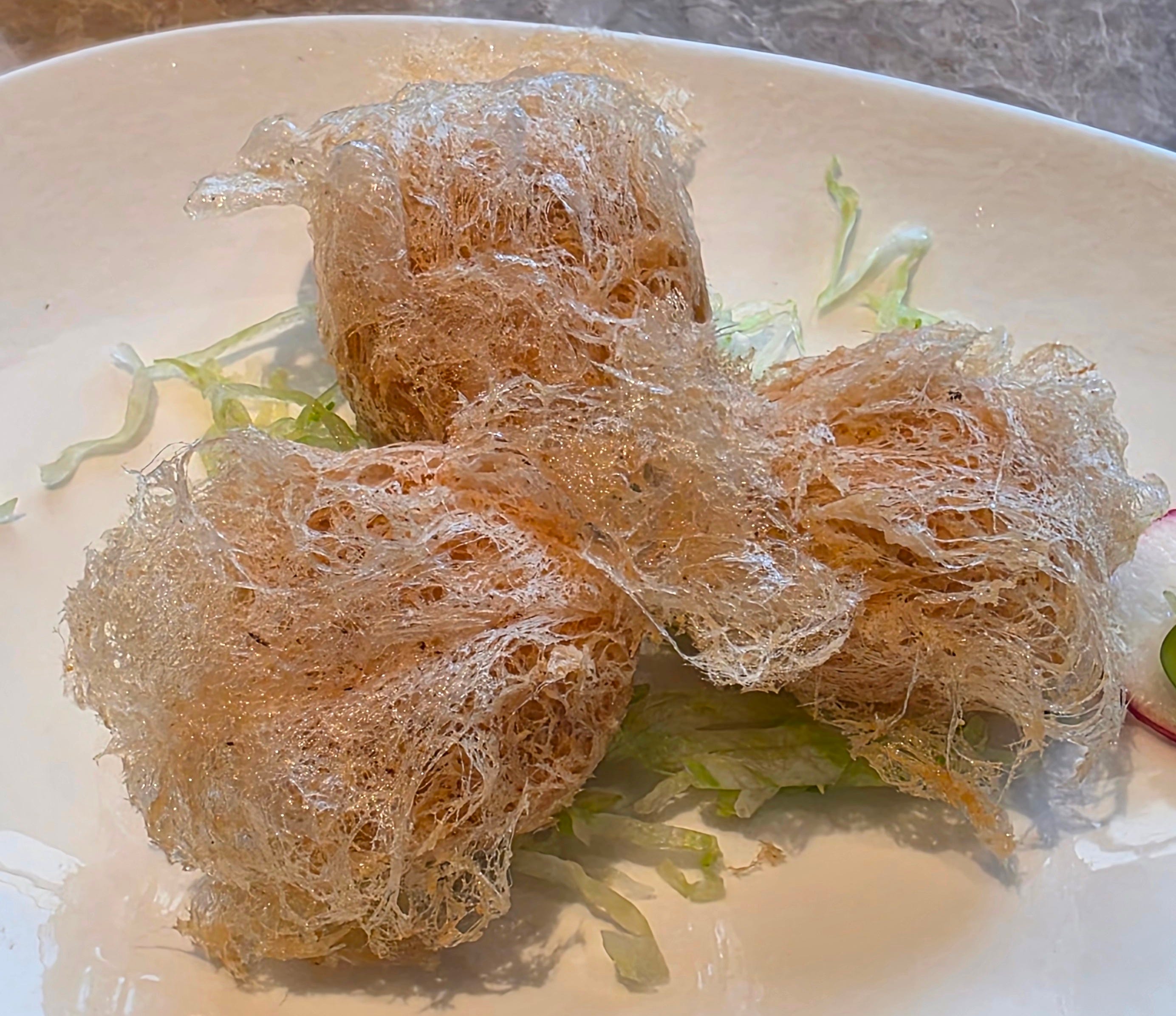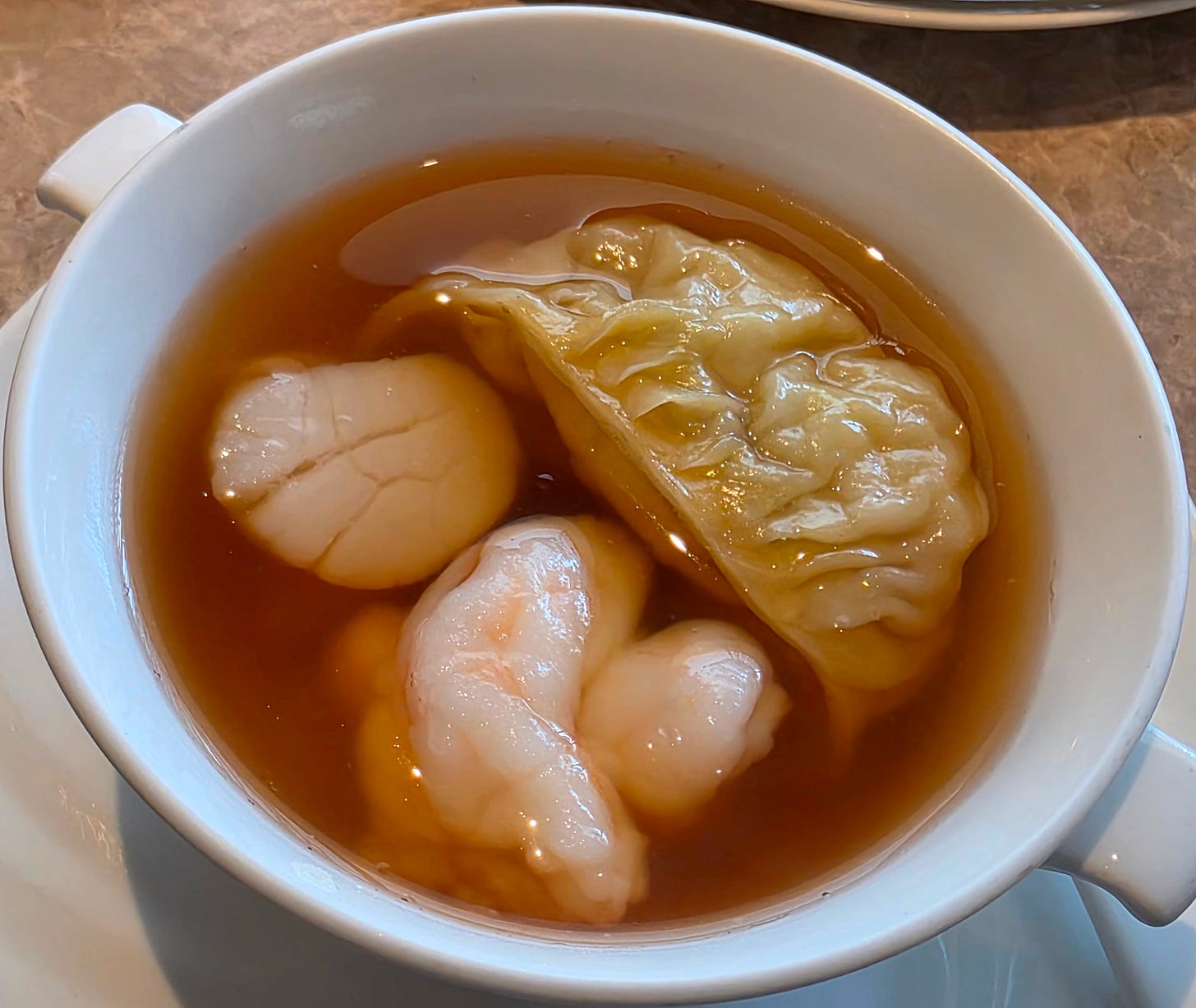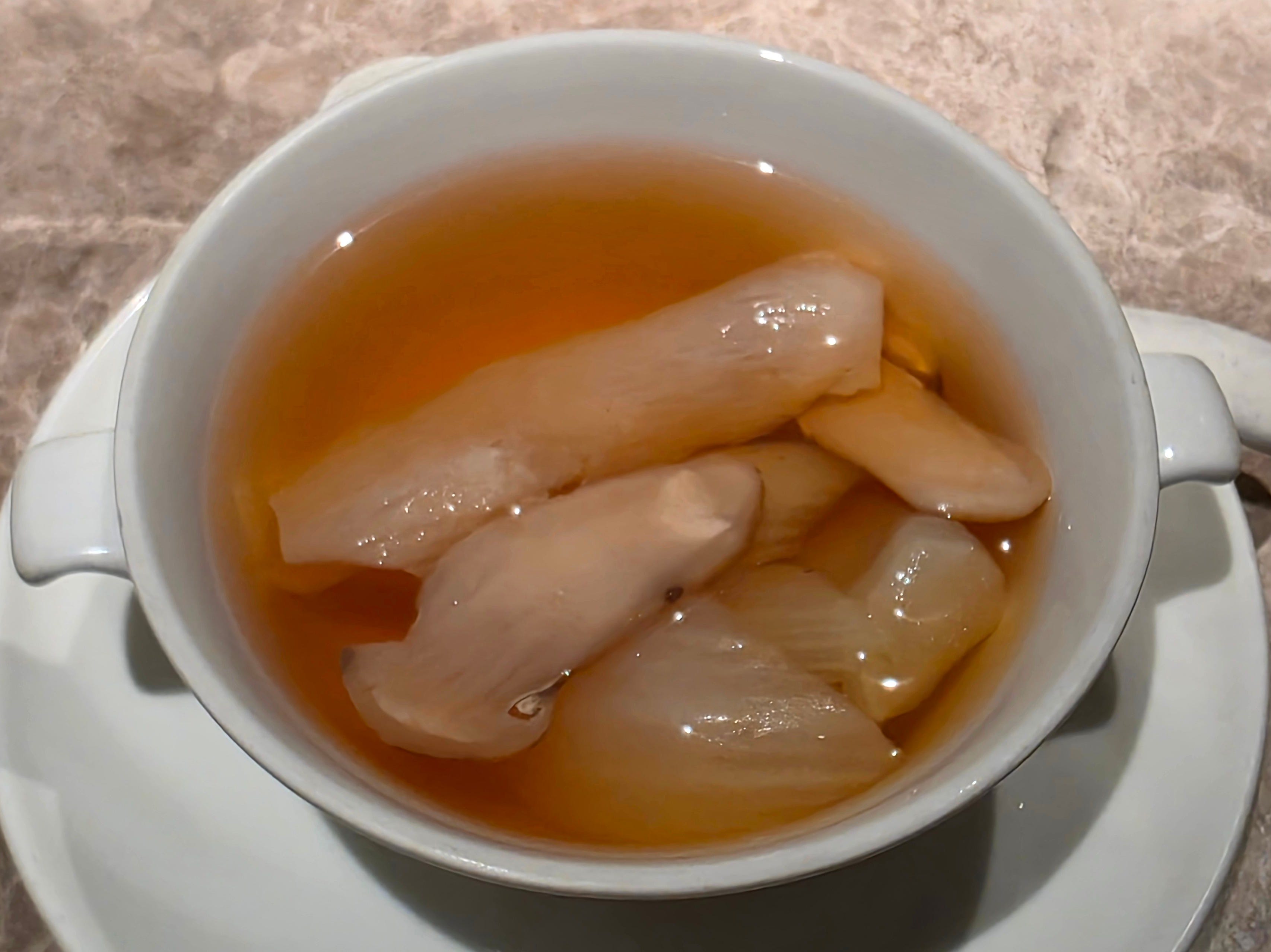 One of the neater dishes of the night was a traditional preparation of poached Tianjin cabbage in rich chicken broth with wolfberries. The cabbage had been carefully carved into the shape of a flower. The dish itself was elegant and soothing, and a reminder that high-end Cantonese cooking often reaches its most sophisticated expression not through extravagance, but through taking a humble ingredient and treating it with extraordinary care.