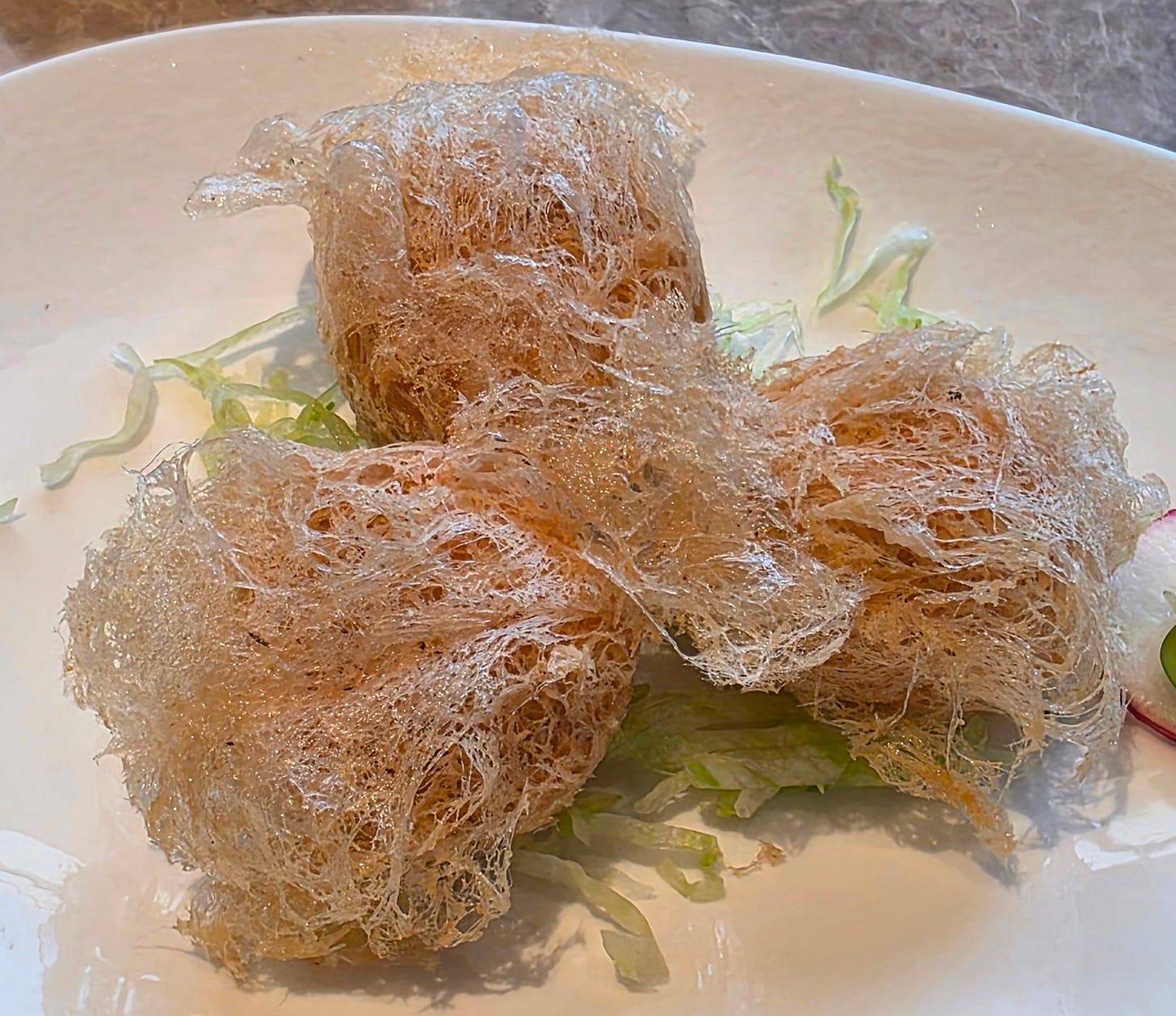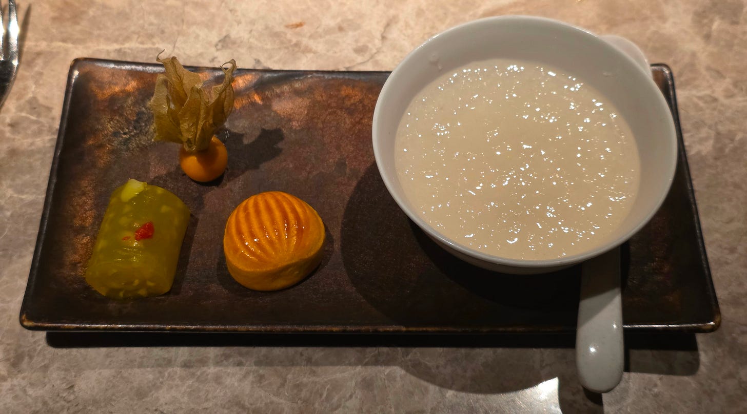 Dessert was relatively traditional, a double-boiled bird’s nest followed by petit fours on the side, including water chestnut jelly and an almond biscuit. It was a gentle ending, not especially theatrical, but consistent with the measured tone of the meal.