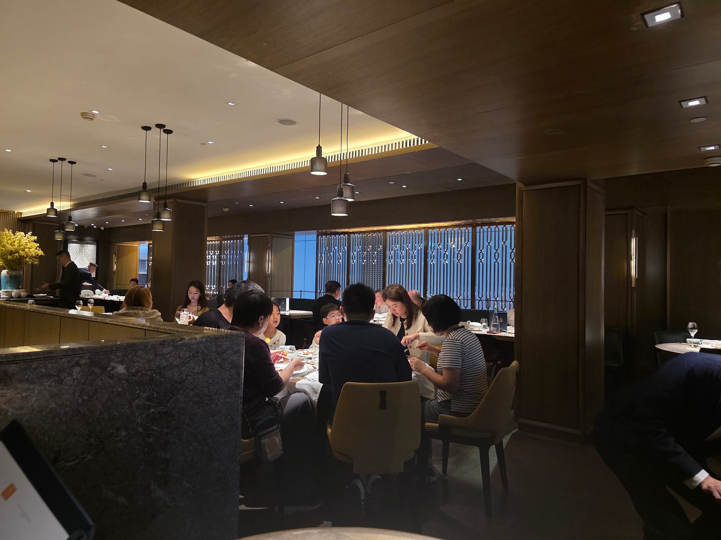 That same idea carries through to the room. The interior is dark, understated, and quietly expensive rather than overtly grand. On our visit, the room was filled with exactly the sort of crowd you would expect: obvious business dinners, family gatherings, and tables that looked like they had been coming here for years. It has the atmosphere of a serious Central dining room, not a showpiece destination for tourists. The effect is more controlled than flashy, which suits the food.