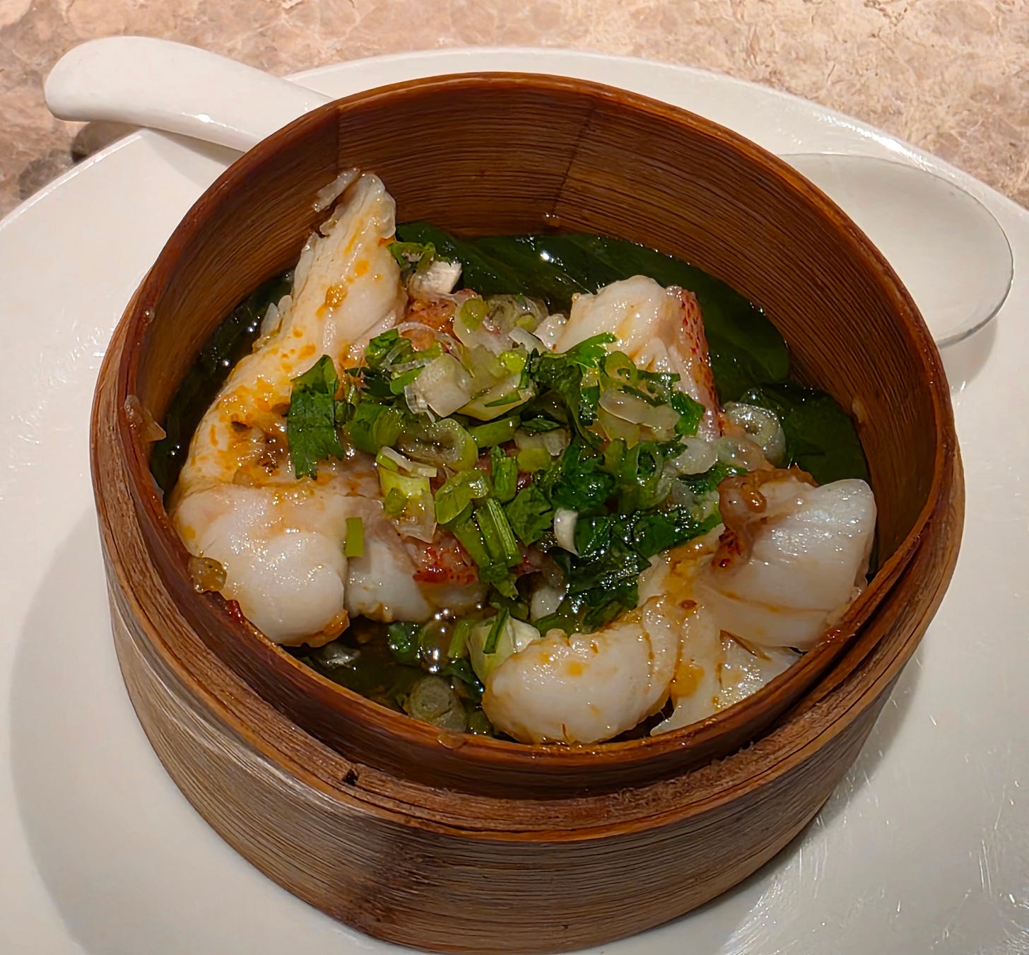 A traditional fish course followed: steamed grouper fillets, deboned for convenience, finished with blistering hot scallion oil. This is one of those Cantonese preparations that can seem almost too simple if you do not stop to think about how much precision it requires. The fish has nowhere to hide. Here, it was handled properly, delicate and clean, with the hot oil providing fragrance rather than brute force.